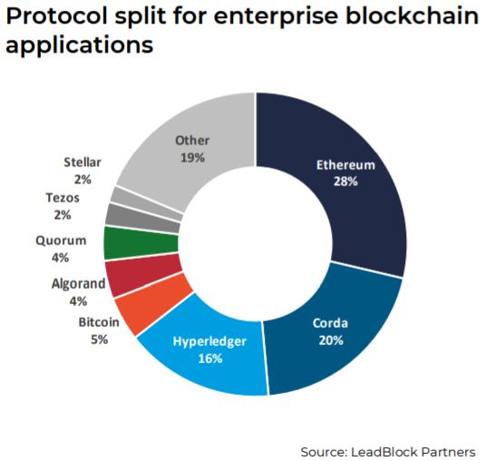 Le fonds de capital-risque britannique LeadBlock Partners a dévoilé le 25 novembre, dans son enquête Enterprise Blockchain 2021, que 65 % des start-up spécialisées dans la blockchain et les actifs numériques pour les entreprises étaient rattachées à trois protocoles : Ethereum (28 %), Corda (20 %) et la suite Hyperledger (16 %). LeadBlock Partners s’est intéressé à plus de 250 start-up du secteur au niveau mondial.