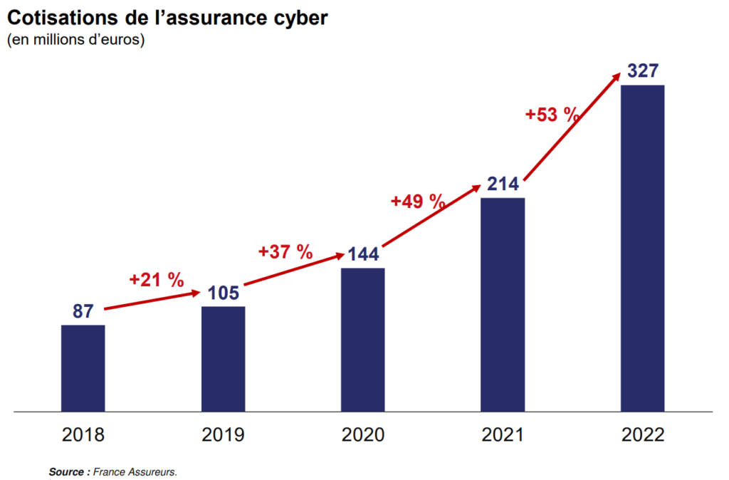 Les cotisations de l’assurance cyber ont crû de 53 % l’an dernier, passant de 214 millions d’euros en 2021 à 327 millions en 2022, selon le bilan annuel de France Assureurs publié le 30 mars.