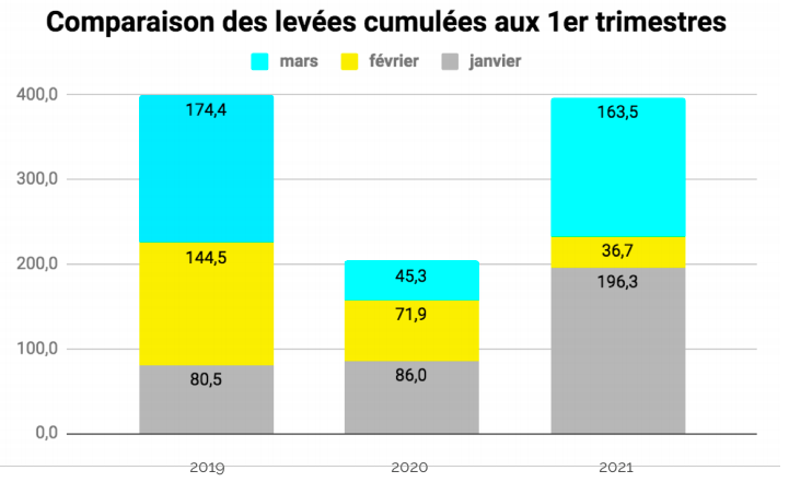 Selon le baromètre trimestriel des levées de fonds de France FinTech et Bpifrance, les fintech françaises ont levé 383,2 millions d’euros au premier trimestre 2021 au cours de 33 opérations – un montant en croissance de 51 % par rapport au T1 2020. “Le ticket moyen s’établit à 11,6 millions d’euros, en léger retrait par rapport à 2020 (15,8 millions d’euros”), ce qui s’explique par un doublement du nombre des opérations (+106 %)”.