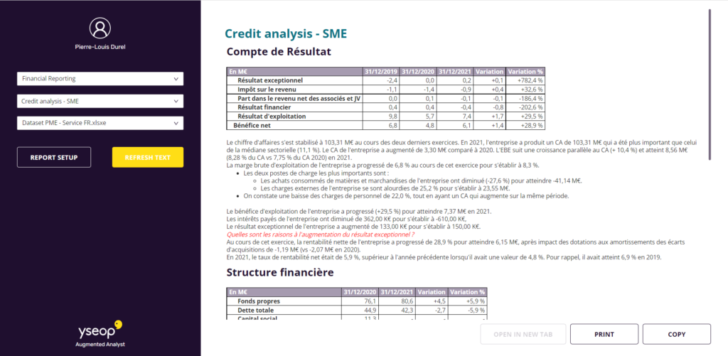 Accueil > Financement > Crédit > Comment BPCE recourt à Yseop pour automatiser la création de ses dossiers de crédit aux entreprises Comment BPCE recourt à Yseop pour automatiser la création de ses dossiers de crédit aux entreprises Le groupe BPCE recourt depuis début 2021 à la plateforme Yseop, qui analyse des bases de données chiffrées pour produire automatiquement des rapports écrits en langage naturel. Plusieurs cas d’usage sont en cours de déploiement, parmi lesquels la production des dossiers de demande de financement des TPE et PME. Yseop et BPCE reviennent sur leur collaboration. Par Aude Fredouelle. Publié le 07 décembre 2021 à 16h19 - Mis à jour le 26 juillet 2022 à 10h31 Ressources Yseop, créée en 2007, propose une plateforme permettant “d’automatiser la création de rapports en faisant parler des bases de données chiffrées et structurées et en les retranscrivant dans un langage écrit”, explique Pierre-Louis Durel, vice-président applications. En 2017, la société a entamé un pivot pour proposer une plateforme SaaS clé en main pouvant être maniée facilement par les équipes de ses clients (voir encadré). Parmi les acteurs séduits par cette nouvelle formule : le groupe BPCE, et plus particulièrement sa direction financière. “Dans le cadre de notre démarche d’innovation, nous souhaitions tester des outils pour divers cas d’usage, sur des segments sur lesquels nous n’étions pas encore assez expérimentés, et la NLG (natural language generation) en faisait partie, se souvient Vincent Schricke, responsable data de l’équipe finance et risque. Nous avons rencontré Yseop dans ce cadre.” Yseop : un pivot vers une plateforme SaaS no code Yseop a franchi une étape majeure en 2017 en entamant un pivot vers sa nouvelle plateforme SaaS, baptisée Yseop augmented analyst. “Nous avons levé des fonds pour la première fois, et ils nous ont permis d’investir massivement sur le produit [auparavant, la société était auto-financée, ndlr], raconte Pierre-Louis Durel. L’objectif était de démocratiser l’accès au produit et l’usage de la NLG et la production automatique de rapports en proposant une plateforme SaaS, verticalisée et clé en main pour automatiser la création de rapports en “no code”, en quelques jours, sans avoir besoin de développements.” Auparavant, la plateforme on-premise nécessitait “un build assez important” avec des coûts associés représentant un frein. “Le lancement de l’offre packagée a permis de réduire le coût d’entrée de notre solution de près de moitié, car les coûts de prestation de services ont été drastiquement réduits”, ajoute le vice-président applications. Désormais, les équipes “customer success” d’Yseop n’ont plus un rôle de gestion de projet mais ont pour but d’accompagner le client dans la prise en main de la plateforme, afin qu’il se lance en toute autonomie dans des projets d’automatisation de rapports. Pour l’y aider, la nouvelle plateforme SaaS et le studio “no code” embarquent des textes et analyses clé en main. “La création des rapports et leur partage ont aussi été simplifiés, avec une interface web également intégrable par API dans les outils du quotidien des analystes comme leurs outils de BI Power BI ou Tableau. Nous sommes aussi intégrés en natif dans l’outil BI Oracle Analytics cloud.” En parallèle, Yseop a aussi “verticalisé” la plateforme : “nous avons créé du contenu et de l’intelligence métier embarquée, explique Pierre-Louis Durel. Par exemple, pour le cas d’usage de l’analyse du risque de crédit utilisé par BPCE, mais aussi pour de l’analyse financière et de la performance (en ciblant les directions financières de tous secteurs), pour accélérer la mise en marché de médicaments dans l’industrie pharmaceutique…” À terme, l’objectif est d’étendre progressivement le périmètre de la plateforme. Pour autant, Yseop a conservé des clients sur son produit historique, “qui continue à évoluer”. Yseop est notamment utilisée par des banques, pour la création automatique de fiches d’entretien client destinées aux collaborateurs. “Mais nous nous concentrons avant tout sur la démocratisation de notre plateforme et de nombreux anciens clients migrent sur elle”, souligne Pierre-Louis Durel. La société, qui compte 80 collaborateurs, revendique une cinquantaine d’applications en production, à la fois en Europe et aux États-Unis (elle réalise plus de 30 % de son chiffre d’affaires à l’international). Parmi ses clients : des banques, des assureurs, des directions financières de tous secteurs et des laboratoires pharmaceutiques. Reporting des directions financières En février 2021, BPCE a testé un premier cas d’usage au sein de la direction financière : le reporting mensuel du crédit habitat envoyé aux réseaux Caisse d’Épargne et Banque Populaire. “L’objectif, en produisant ce reporting automatiquement avec Yseop, était de le faire régulièrement alors qu’il était jusqu’ici réalisé de façon plus dilettante, mais aussi de réaliser une analyse fine au niveau de chaque établissement, région et agence, et non plus seulement au niveau du groupe”, raconte Vincent Schricke. BPCE a fait face à plusieurs difficultés au cours de son élaboration. D’abord, “la nécessité d’intégrer l’évolution réglementaire importante de la Banque de France, qui impose une surveillance accrue lors de l’attribution des crédits, énumère le directeur data. Nous avons profité de ce projet pour faire connaître les nouvelles règles un peu touffues”. Ensuite, la conduite du changement : “il a fallu convaincre l’équipe de production, constituée d’une dizaine de personnes, de l’intérêt de la plateforme, car certains doutaient qu’un robot puisse remplacer leur compétence métier. Nous avons multiplié les communication