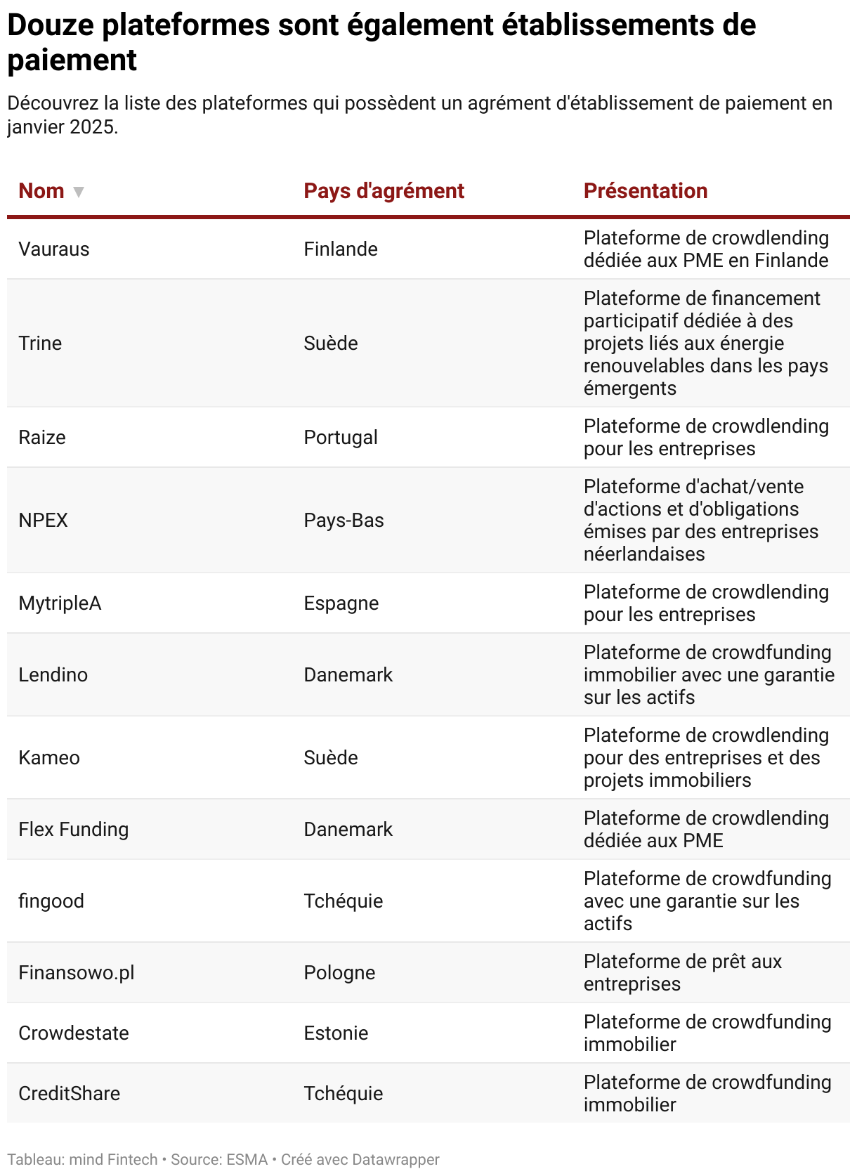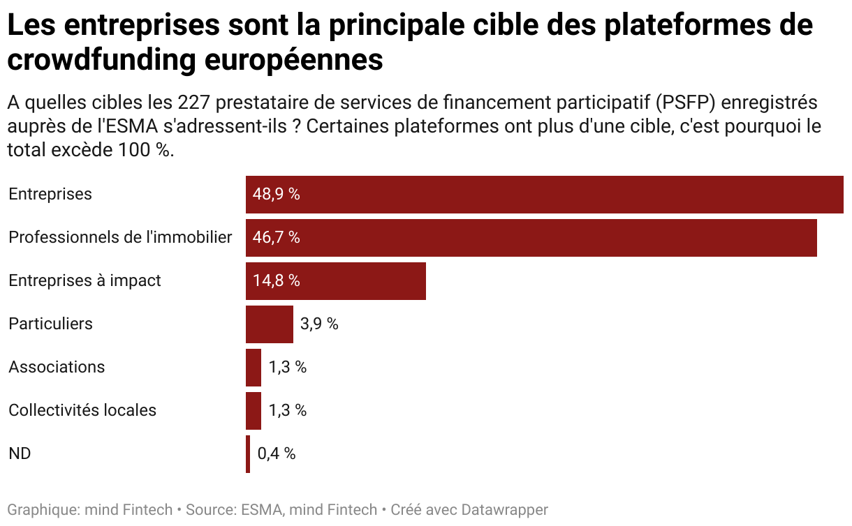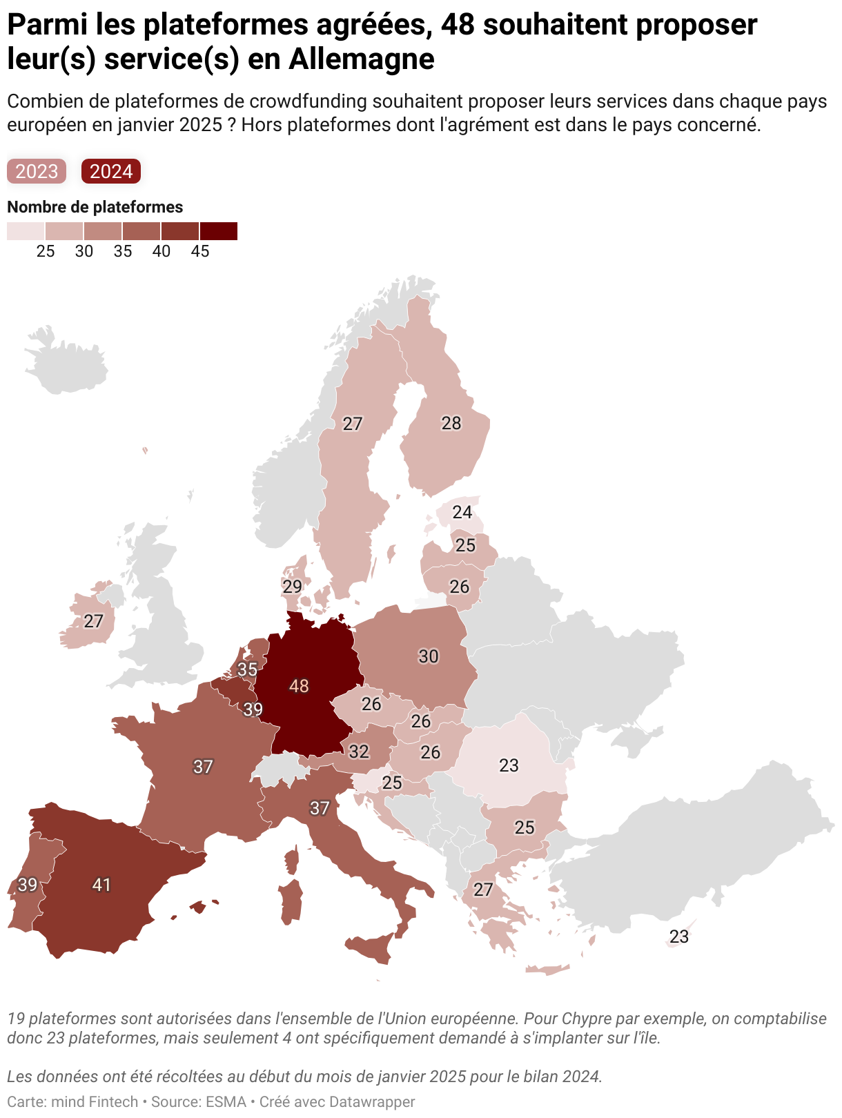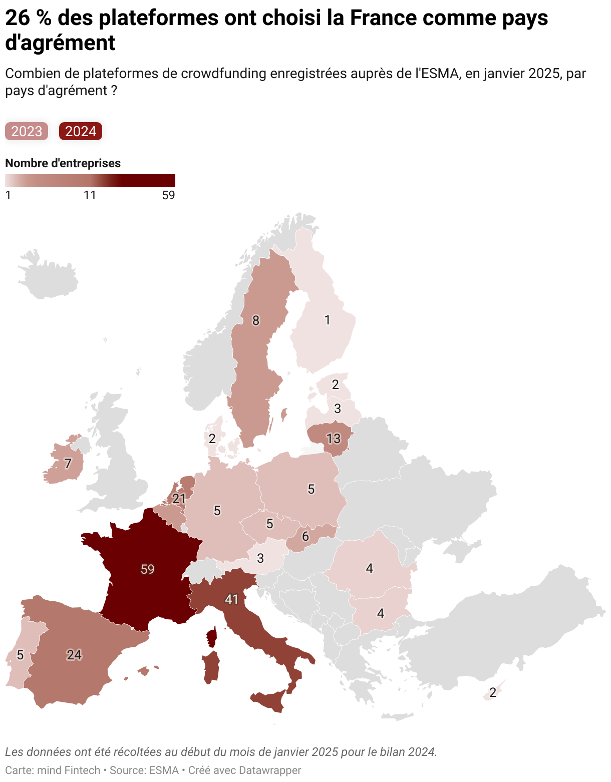 Accueil > Financement > PSFP : plus de 200 plateformes de crowdfunding ont décroché l’agrément européen, dont 59 en France PSFP : plus de 200 plateformes de crowdfunding ont décroché l’agrément européen, dont 59 en France En janvier 2025, les plateformes de crowdfunding françaises agréées PSFP représentent toujours le plus grand contingent européen, devant l’Italie. Services proposés, clientèles cibles, passeports, instruments financiers… mind Fintech a de nouveau exploré et analysé le registre européen. Par Antoine Duroyon et Rudy Degardin. Publié le 23 janvier 2025 à 6h00 - Mis à jour le 22 janvier 2025 à 16h48 Ressources Depuis novembre 2023, les plateformes de crowdfunding souhaitant exercer dans l’Union européenne sont tenues d’obtenir un agrément de prestataire de services de financement participatif (PSFP). L’Autorité européenne des marchés financiers (ESMA) tient un registre de toutes les sociétés qui l’ont obtenu. Outre leur nom, leur forme légale ou leur adresse, on y trouve les pays membres où chaque acteur exerce, les services qu’il fournit, ainsi que la liste de ses autres activités non couvertes par la régulation. mind Fintech a analysé ces données, en janvier 2025, pour la troisième fois, et les a enrichies en associant d’autres informations à chaque plateforme : les cibles de leurs prêts ou investissements, les segments d’activité des projets soutenus, ou encore la nature des instruments financiers qu’elles proposent (voir la méthodologie à la fin de cette analyse). La liste des plateformes de crowdfunding européennes agréées PSFP La France toujours en tête En janvier 2025, l’ESMA comptabilise 227 PSFP agréées dans 22 pays. À la même période, l’année dernière, elle en dénombrait 109 provenant de 18 États membres différents. Chypre, le Portugal, l’Irlande et Malte sont désormais représentés dans le registre. Avec 59 plateformes agréées, contre 35 en janvier 2024, la France apparaît toujours comme le marché le mieux représenté, devant l’Italie, qui en compte 40. “La réglementation a été plutôt laborieuse et douloureuse à mettre en place pour les plateformes françaises. Des revirements ont pu les mettre dans une situation inconfortable, comme l’obligation, non anticipée, de désigner deux dirigeants effectifs”, se remémore Florence de Maupeou, déléguée générale adjointe de France Fintech, chargée des relations institutionnelles et du financement participatif. Les plateformes peuvent être autorisées pour deux services de financement, l’un consistant à faciliter l’octroi de prêts, l’autre à permettre le placement sans engagement ferme de valeurs mobilières, c’est-à-dire l’investissement en titres, qu’il s’agisse d’actions ou d’obligations, par exemple. 29,5 % des acteurs proposent uniquement ce second service, et 11,5 % exclusivement le premier. Près de deux tiers des plateformes (59 %) proposent les deux, alors qu’elles n’étaient que 30 % à l’automne 2023. Outre ces deux activités qui définissent l’activité de crowdfunding, les plateformes ont aussi déclaré à l’ESMA leurs autres services. 34 % d’entre elles attribuent, par exemple, des notes de crédit aux projets qu’elles présentent. Et 29 % proposent un tableau d’affichage (“bulletin board”), permettant de recenser les intentions de cession de titres des souscripteurs et favorisant les échanges de gré à gré. Quels instruments financiers ? Pour compléter l’analyse du positionnement des plateformes, nous avons identifié si elles proposent aux contributeurs de souscrire auprès des porteurs de projets de la dette, qu’il s’agisse d’obligations ou de prêts à titre onéreux, ou des parts au capital (actions). 76,4 % des plateformes proposent de la dette, et 38 % de l’equity. Le financement sous forme de don a été exclu du champ de la réglementation européenne. En France, le statut national d’IFP demeure pour les plateformes qui souhaitent le proposer, ainsi que pour les cagnottes en ligne. Selon nos constats, au moins deux acteurs agréés PSFP, les Français Enerfip et CredoFunding, mentionnent explicitement une activité autour du don. Le 8 janvier 2025, l’ESMA a publié un rapport dressant un panorama du crowdfunding en Europe en 2023. Remontées par les régulateurs nationaux, les données couvrent 98 plateformes dans 17 pays. Elles évaluent le montant total intermédié à plus d’un milliard d’euros, avec un poids significatif du modèle de prêt (65 % du financement) devant l’obligataire (17 %) et les actions (6 %). Parmi les projets pris en compte dans l’étude, 43 % ont récolté plus d’un million d’euros. Par ailleurs, les investisseurs sont très majoritairement (à 87 %) des particuliers, bien loin devant les investisseurs “sophistiqués” (12 %) selon le régime PSFP et les investisseurs “professionnels” selon MiFID (1 %). Fait surprenant, l’ESMA note que la Lituanie est l’un des marchés les plus actifs. Le pays compte près de 500 000 investisseurs actifs en crowdfunding, soit environ un cinquième de la population adulte. Une volonté d’implantation inégale Les plateformes précisent auprès de l’ESMA la liste des pays de l’UE où elles souhaitent fournir leurs services grâce au passeport européen. 72 plateformes sur 227 en ont demandé un. Elles déclarent en moyenne onze pays, mais il existe une grande disparité d’une plateforme à une autre. Ainsi, 19 entreprises souhaitent s’implanter dans les 27 pays membres de l’UE. Parmi elles figurent six plateformes agréées en Espagne (dont la plateforme britannique de crowdequity Crowdcube), quatre en France (dont la plateforme de crowdfunding immobilier en obligations Bricks) ou encore trois en Lettonie (dont la plateforme d’equity crowdfunding CrowdedHero). À l’inverse, 12 plateformes, soit 16,7 % de l’ensemble, ne souhaitent pr