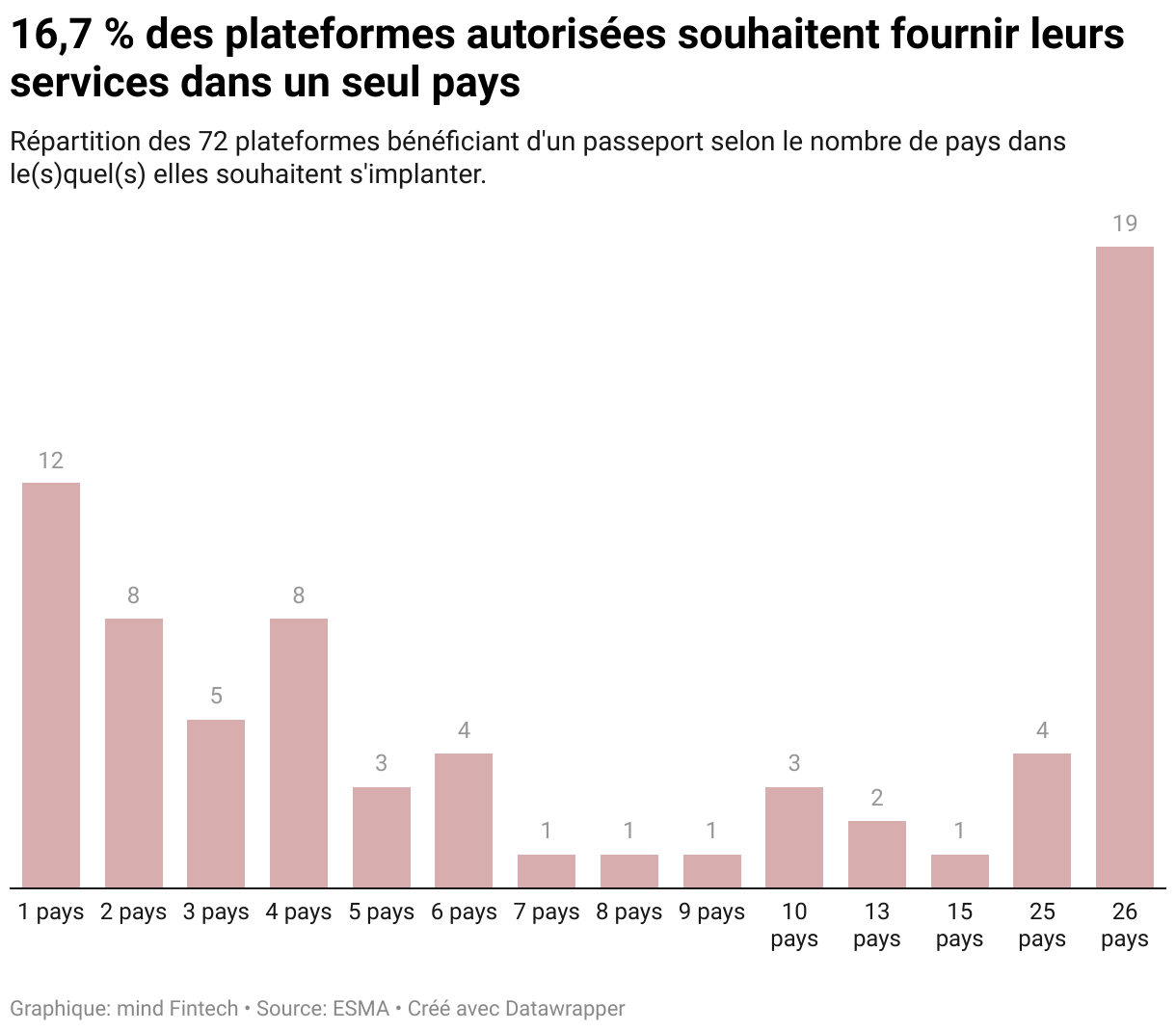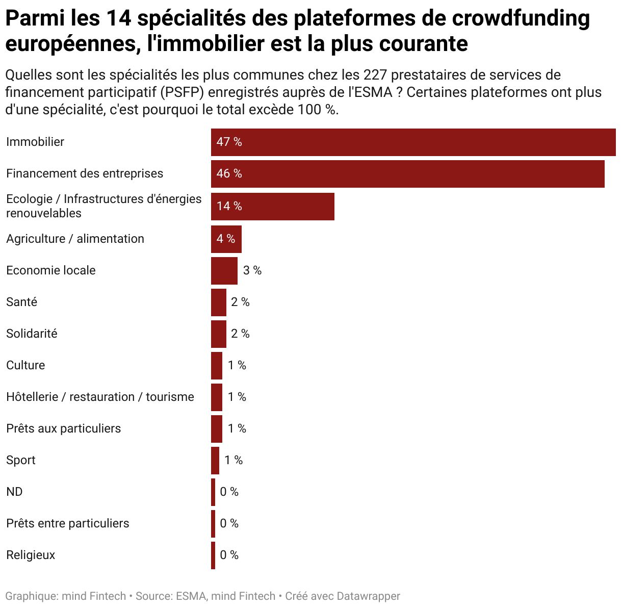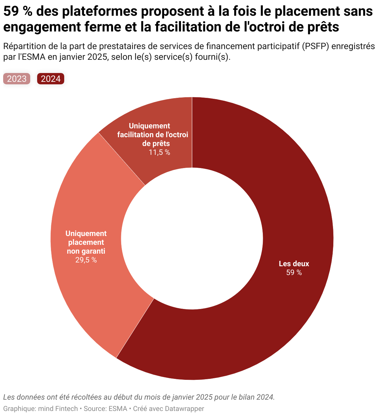 Accueil > Financement > PSFP : plus de 200 plateformes de crowdfunding ont décroché l’agrément européen, dont 59 en France PSFP : plus de 200 plateformes de crowdfunding ont décroché l’agrément européen, dont 59 en France En janvier 2025, les plateformes de crowdfunding françaises agréées PSFP représentent toujours le plus grand contingent européen, devant l’Italie. Services proposés, clientèles cibles, passeports, instruments financiers… mind Fintech a de nouveau exploré et analysé le registre européen. Par Antoine Duroyon et Rudy Degardin. Publié le 23 janvier 2025 à 6h00 - Mis à jour le 22 janvier 2025 à 16h48 Ressources Depuis novembre 2023, les plateformes de crowdfunding souhaitant exercer dans l’Union européenne sont tenues d’obtenir un agrément de prestataire de services de financement participatif (PSFP). L’Autorité européenne des marchés financiers (ESMA) tient un registre de toutes les sociétés qui l’ont obtenu. Outre leur nom, leur forme légale ou leur adresse, on y trouve les pays membres où chaque acteur exerce, les services qu’il fournit, ainsi que la liste de ses autres activités non couvertes par la régulation. mind Fintech a analysé ces données, en janvier 2025, pour la troisième fois, et les a enrichies en associant d’autres informations à chaque plateforme : les cibles de leurs prêts ou investissements, les segments d’activité des projets soutenus, ou encore la nature des instruments financiers qu’elles proposent (voir la méthodologie à la fin de cette analyse). La liste des plateformes de crowdfunding européennes agréées PSFP La France toujours en tête En janvier 2025, l’ESMA comptabilise 227 PSFP agréées dans 22 pays. À la même période, l’année dernière, elle en dénombrait 109 provenant de 18 États membres différents. Chypre, le Portugal, l’Irlande et Malte sont désormais représentés dans le registre. Avec 59 plateformes agréées, contre 35 en janvier 2024, la France apparaît toujours comme le marché le mieux représenté, devant l’Italie, qui en compte 40. “La réglementation a été plutôt laborieuse et douloureuse à mettre en place pour les plateformes françaises. Des revirements ont pu les mettre dans une situation inconfortable, comme l’obligation, non anticipée, de désigner deux dirigeants effectifs”, se remémore Florence de Maupeou, déléguée générale adjointe de France Fintech, chargée des relations institutionnelles et du financement participatif. Les plateformes peuvent être autorisées pour deux services de financement, l’un consistant à faciliter l’octroi de prêts, l’autre à permettre le placement sans engagement ferme de valeurs mobilières, c’est-à-dire l’investissement en titres, qu’il s’agisse d’actions ou d’obligations, par exemple. 29,5 % des acteurs proposent uniquement ce second service, et 11,5 % exclusivement le premier. Près de deux tiers des plateformes (59 %) proposent les deux, alors qu’elles n’étaient que 30 % à l’automne 2023. Outre ces deux activités qui définissent l’activité de crowdfunding, les plateformes ont aussi déclaré à l’ESMA leurs autres services. 34 % d’entre elles attribuent, par exemple, des notes de crédit aux projets qu’elles présentent. Et 29 % proposent un tableau d’affichage (“bulletin board”), permettant de recenser les intentions de cession de titres des souscripteurs et favorisant les échanges de gré à gré. Quels instruments financiers ? Pour compléter l’analyse du positionnement des plateformes, nous avons identifié si elles proposent aux contributeurs de souscrire auprès des porteurs de projets de la dette, qu’il s’agisse d’obligations ou de prêts à titre onéreux, ou des parts au capital (actions). 76,4 % des plateformes proposent de la dette, et 38 % de l’equity. Le financement sous forme de don a été exclu du champ de la réglementation européenne. En France, le statut national d’IFP demeure pour les plateformes qui souhaitent le proposer, ainsi que pour les cagnottes en ligne. Selon nos constats, au moins deux acteurs agréés PSFP, les Français Enerfip et CredoFunding, mentionnent explicitement une activité autour du don. Le 8 janvier 2025, l’ESMA a publié un rapport dressant un panorama du crowdfunding en Europe en 2023. Remontées par les régulateurs nationaux, les données couvrent 98 plateformes dans 17 pays. Elles évaluent le montant total intermédié à plus d’un milliard d’euros, avec un poids significatif du modèle de prêt (65 % du financement) devant l’obligataire (17 %) et les actions (6 %). Parmi les projets pris en compte dans l’étude, 43 % ont récolté plus d’un million d’euros. Par ailleurs, les investisseurs sont très majoritairement (à 87 %) des particuliers, bien loin devant les investisseurs “sophistiqués” (12 %) selon le régime PSFP et les investisseurs “professionnels” selon MiFID (1 %). Fait surprenant, l’ESMA note que la Lituanie est l’un des marchés les plus actifs. Le pays compte près de 500 000 investisseurs actifs en crowdfunding, soit environ un cinquième de la population adulte. Une volonté d’implantation inégale Les plateformes précisent auprès de l’ESMA la liste des pays de l’UE où elles souhaitent fournir leurs services grâce au passeport européen. 72 plateformes sur 227 en ont demandé un. Elles déclarent en moyenne onze pays, mais il existe une grande disparité d’une plateforme à une autre. Ainsi, 19 entreprises souhaitent s’implanter dans les 27 pays membres de l’UE. Parmi elles figurent six plateformes agréées en Espagne (dont la plateforme britannique de crowdequity Crowdcube), quatre en France (dont la plateforme de crowdfunding immobilier en obligations Bricks) ou encore trois en Lettonie (dont la plateforme d’equity crowdfunding CrowdedHero). À l’inverse, 12 plateformes, soit 16,7 % de l’ensemble, ne souhaitent pr