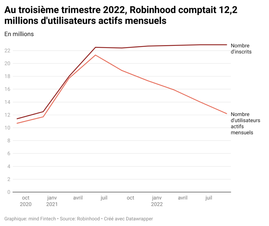 Pour le cinquième trimestre consécutif, le néocourtier Robinhood a annoncé une perte d’utilisateurs actifs mensuellement, passant de 21,3 millions à la fin du deuxième trimestre 2021 à 12,2 millions fin septembre 2022. Les utilisateurs actifs qui étaient montés en flèche durant la période des “meme stocks” début 2021, se font en effet désormais plus rares : presque la totalité des inscrits (98 %) avaient effectué au moins une opération au premier trimestre 2021, au plus fort du phénomène, contre un sur deux (53 %) au troisième trimestre 2022. Et avec des marchés actions et crypto en berne, le nombre d’inscrits sur la plateforme stagne (+ 60 000 au troisième trimestre 2022).