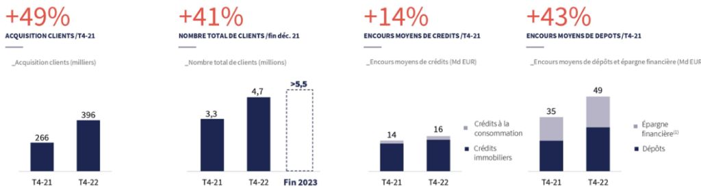 Accueil > Services bancaires > Banque au quotidien > Boursorama a abaissé de 20 % son coût d’acquisition en 2022 Boursorama a abaissé de 20 % son coût d’acquisition en 2022 Par Aude Fredouelle. Publié le 08 février 2023 à 18h14 - Mis à jour le 27 février 2023 à 17h48 Ressources Boursorama a recruté 1,5 million de nouveaux clients l’an dernier, dont 315 000 clients à la suite du rachat d’ING en France (soit deux clients éligibles sur trois). La banque en ligne, qui atteint 4,7 millions de clients fin 2022, en hausse de 41 % sur un an, indique avoir toutefois abaissé son coût d’acquisition de 20 % en 2022. Il faut dire que depuis 2015, elle investit massivement dans sa croissance et les coûts d’acquisition représentent plus de 40 % de ses charges, comme l’écrivait récemment son directeur général Benoît Grisoni dans une tribune pour Revue Banque. Plus de 51 % des clients utilisent Boursorama comme banque principale. En moyenne, les clients se connectent 15 fois à leurs comptes et réalisent 16 opérations carte chaque mois. Les encours totaux de la banque sont naturellement en hausse : ils s’élèvent à plus de 66 milliards d’euros fin 2022, en augmentation de plus de 15 milliards sur un an, notamment grâce à la collecte de dépôts (+ 43 % sur un an). Ses clients, âgés de 35 ans en moyenne, ont 15 000 euros d’encours en moyenne. À noter : Boursorama vise plus de 5,5 millions de clients d’ici fin 2023 et prévoit d’atteindre “une forte rentabilité” dès 2024. Aude Fredouelle banque de détailbanque en ligne Besoin d’informations complémentaires ? Contactez le service d’études à la demande de mind À lire Le classement des néobanques et banques en ligne qui ont le plus de clients en France Les offres des acteurs de la banque numérique