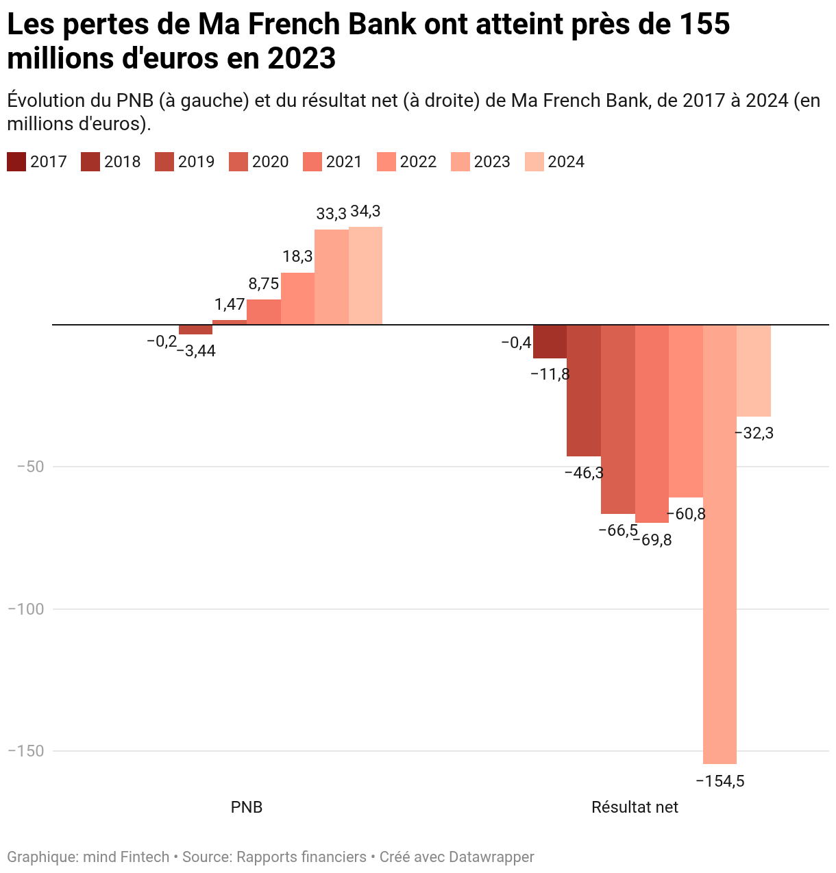 Le produit net bancaire de Ma French Bank a culminé à 34,3 millions d’euros en 2024. La filiale a cependant accumulé les pertes – plus de 440 millions d’euros entre 2017 et 2024, avec un pic à près de 155 millions en 2023.