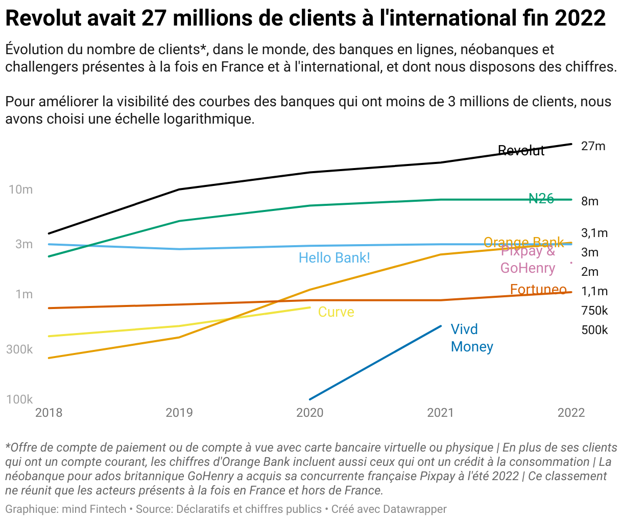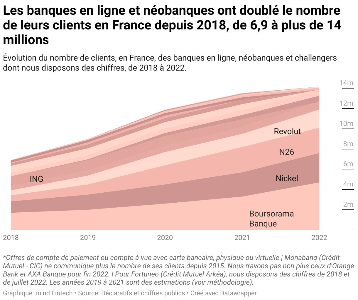 Accueil > Services bancaires > Banque au quotidien > Les banques en ligne et néobanques ont doublé le nombre de leurs clients en France depuis 2018 Les banques en ligne et néobanques ont doublé le nombre de leurs clients en France depuis 2018 Comme chaque année, mind Fintech fait le point sur le développement des banques en ligne, challengers et néobanques en France. En 2022, plusieurs ont connu de très fortes croissances : Boursorama Banque a gagné 1,4 million de clients, notamment grâce au rachat d’ING, et Nickel et Revolut ont chacun recruté 500 000 clients supplémentaires. Par Aymeric Marolleau et Aude Fredouelle avec Antoine Duroyon et Caroline Soutarson. Publié le 15 mars 2023 à 16h11 - Mis à jour le 19 avril 2023 à 17h44 Ressources Cet article est le premier d’une série consacrée aux banques en ligne et néobanques, comparant le nombre de leurs clients en France et dans le monde, ainsi que leurs offres : Les banques en ligne et néobanques ont doublé le nombre de leurs clients en France depuis 2018 Tarifs, modes de facturation, type de carte… Quelles offres chez les banques en ligne et les néobanques en 2022 ? Plus d’une vingtaine de banques en ligne et néobanques espèrent convaincre les consommateurs français d’ouvrir un compte sur leurs services. Pour se faire une idée des forces en présence et de leurs stratégies d’acquisition, mind Fintech les a interrogées, pour la cinquième année consécutive, sur leurs chiffres au 31 décembre 2022 (voir la méthodologie en fin d’article). Le classement des banques en ligne et néobanques qui ont le plus de clients en France Des chiffres difficiles à obtenir Tous les acteurs sollicités n’ont pas partagé avec nous leurs chiffres les plus récents pour la France. C’est notamment le cas d’Orange Bank (421 000 clients fin 2021), puisqu’Orange ne publiera ses résultats qu’en mai, d’AXA Banque (600 000 clients fin 2021, mais dont certains ne détenaient que des produits d’épargne) – qui indique désormais être plutôt tourné vers les clients assurés chez AXA et ses salariés que vers le grand public – et de BforBank (240 000 clients fin 2021). Monabanq, la banque en ligne du groupe Crédit Mutuel – CIC, ne communique plus ses chiffres depuis 2015. Parmi les absents, citons aussi Curve, Pixpay, Fintch, Lydia (qui ne communique que sur le nombre de clients en Europe) et Vivid Money. Pixpay nous a fourni des chiffres à l’international qui incluent également ceux de Gohenry, qui l’a récemment racheté. Les néobanques vertes OnlyOne, Hélios et Green-Got n’ont pas non plus souhaité répondre. Depuis notre précédent baromètre, plusieurs néobanques ont fermé leurs portes, dont Pumpkin (93 000 clients fin 2021) et Aumax pour moi (185 000 clients fin 2021), du groupe Crédit Mutuel Arkéa. Boursorama Banque continue de croître rapidement Boursorama Banque continue de dominer le marché français, puisque la banque en ligne a atteint 4,7 millions de clients fin 2022, soit 1,4 million de plus qu’en 2021 (+42 %). Dont 315 000 à la suite de la reprise du portefeuille de clients d’ING, qui comptait 750 000 clients en France lorsqu’elle a annoncé la cessation de ses activités dans le pays, en décembre 2021. La filiale de la Société Générale investit massivement dans sa croissance depuis 2015, en ne lésinant pas sur les budgets marketing et d’acquisition, afin d’atteindre une taille critique. “Les coûts d’acquisition représentent plus de 40 % de l’ensemble des charges de la banque pendant cette phase de développement”, écrivait son directeur général, Benoît Grisoni, dans une tribune pour Revue Banque début 2022. La banque en ligne ne compte pas s’arrêter là, et vise 5,5 millions de clients fin 2023. Pour autant, elle commence à rationaliser ses coûts en vue de retrouver le chemin de la rentabilité, puisque Benoît Grisoni indique viser “une forte rentabilité” dès 2024. La banque en ligne a ainsi abaissé de 20 % son coût d’acquisition en 2022. “Boursorama a fait le choix de longue date d’investir pour grossir rapidement en cherchant à atteindre plusieurs millions de clients. D’autres misent sur une stratégie différente, comme Fortuneo qui possède un fonds de commerce moins fourni [600 000 en juillet 2022 en France, Ndlr], mais qui génère des revenus par client plus élevés par l’équipement”, analyse Nicolas Darbo, Partner au sein du cabinet Accuracy. Outre le nombre de clients, les autres voyants sont au vert : les encours de la banque s’élèvent à plus de 66 milliards d’euros fin 2022, en augmentation de plus de 15 milliards sur un an, notamment grâce à la collecte de dépôts (+43 % sur un an). De quoi embellir les futurs résultats 2023 de la banque en ligne, dans un contexte de hausse des taux de rémunération des dépôts. Boursorama en fait d’ailleurs profiter ses clients, puisque la société a annoncé le 9 mars le lancement d’un compte à terme avec un taux de 3 % sur 12 mois. Boursorama devance Nickel, qui a gagné 500 000 clients l’an dernier (+21 %), ce qui lui fait franchir les 2,9 millions de clients. Lors d’un webinaire organisé par Syrtals le 9 mars, intitulé “La saga des néobanques”, Marie Degrand-Guillaud, directrice générale déléguée de Nickel, a indiqué que la néobanque compte désormais 7 000 points de vente chez les buralistes, ce qui lui permet “d’avoir un coût d’acquisition légèrement inférieur à celui de ses concurrents et d’être rentable depuis fin 2018”. Nickel a ainsi probablement dépassé N26, qui n’a pas communiqué à mind Fintech de chiffre plus précis que “plus de 2,5 millions de clients fin 2022” (le challenger avait franchi le cap des 2 millions en juin 2021). Revolut s’en rapproche, fort d’une croissance de près de 40 % l’an dernier, avec 1,8 million de clients français. En mai 2022, le challenger britannique a