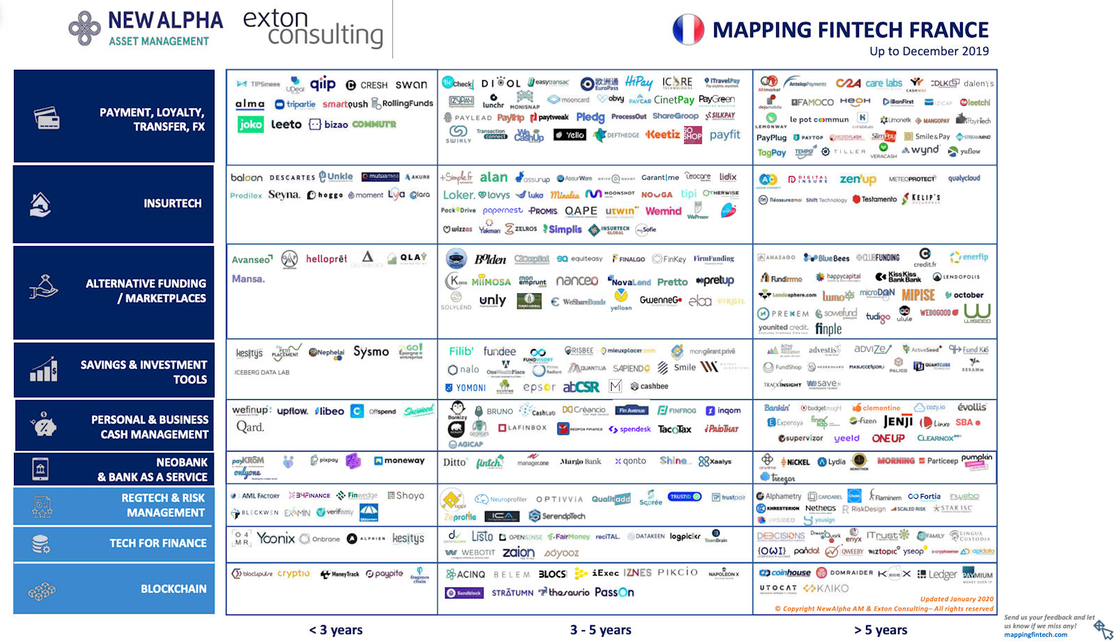 Accueil > Services bancaires > Mapping Fintech France 2020 (NewAlpha AM, Exton Consulting) Mapping Fintech France 2020 (NewAlpha AM, Exton Consulting) La société de gestion NewAlpha Asset Management et le cabinet de conseil Exton Consulting ont associé leurs expertises et leurs complémentarités afin de proposer la troisième édition de leur cartographie annuelle des fintech entrepreneuriales françaises établie à fin décembre 2019. Par Antoine Duroyon. Publié le 30 novembre 2020 à 10h33 - Mis à jour le 21 juin 2021 à 10h36 Ressources Ce qu’il faut retenir : – 352 fintech françaises, entrepreneuriales, établies et substantiellement actives à fin 2019 ont été recensées et analysées dans cette cartographie actualisée du marché français. 134 sociétés ont été ajoutées ou retirées par rapport à l’édition précédente. – La dynamique entrepreneuriale des fintech françaises reste soutenue en 2019 : 83 nouvelles structures ont fait leur entrée dans cette nouvelle édition. Il s’agit soit de sociétés constituées en 2019, soit de sociétés ayant activé leurs opérations au cours de l’année. – Un fort taux de renouvellement est à observer puisque parallèlement à ces 83 entrées, 51 fintech présentes l’année dernière ne figurent plus dans cette nouvelle édition essentiellement pour cause d’activité faible ou de pivotement de modèle économique , de cessation d’activité, ou consécutivement au mouvement de consolidation observable sur certains segments fintech. – Les paytech constituent encore le plus grand vivier entrepreneurial avec plus de 20 % des fintech françaises, tandis que les Tech for Fin et les néobanques qui adressent des marchés spécifiques affichent une croissance soutenue. – Le poids croissant des fintech françaises en activité depuis plus de 5 ans illustre leur aptitude à s’inscrire durablement dans le paysage financier national et international grâce notamment à la qualité d’exécution de leur plan et leur financement par des investisseurs nationaux mais aussi étrangers. Le document se penche également sur les évolutions de plusieurs segments d’activité en 2019 : paiement, fidélisation, transfert de fonds, change ; insurtech ; financement alternatif et marketplace ; épargne et investissement ; gestion des flux financiers ; néobanque et Banking-as-a-Service ; regtech et gestion du risque ; tech for fin ; blockchain. Pour agrandir, cliquez sur l’image Antoine Duroyon panorama Besoin d’informations complémentaires ? Contactez le service d’études à la demande de mind À lire Etude gratuit Cartographie de la fintech