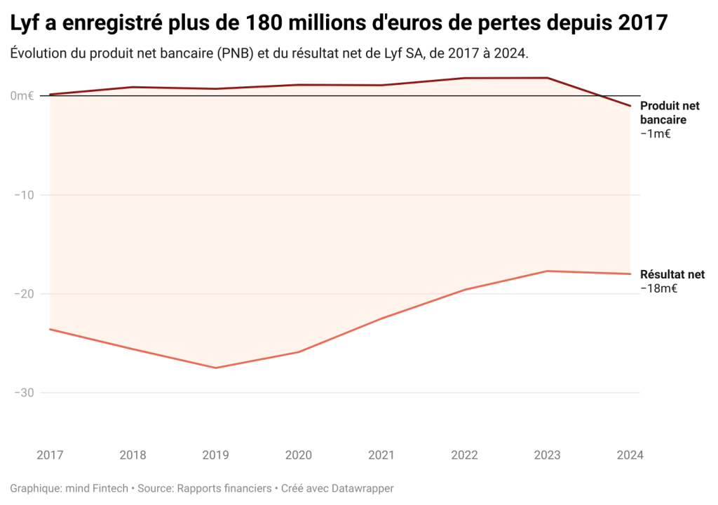 Accueil > Services bancaires > Paiements > [Info mind Fintech] Lyf a enregistré un PNB négatif en 2024 [Info mind Fintech] Lyf a enregistré un PNB négatif en 2024 Par Aude Fredouelle. Publié le 15 octobre 2025 à 17h51 - Mis à jour le 15 octobre 2025 à 18h19 Ressources La société Lyf SAS, détenue pour moitié par BNP Paribas et Euro-Information, filiale du groupe Crédit Mutuel – Mastercard et Casino ne détenant plus qu’une fraction minime, moins de 0,4 % combinés -, a enregistré un produit net bancaire (PNB) négatif en 2024, à hauteur de 1 million d’euros environ, selon les résultats du groupe Crédit Mutuel consultés par mind Fintech (arrondis au million près), contre un PNB positif de 2 millions d’euros l’année précédente. Sa perte nette s’établit à 18 millions d’euros, un niveau identique à celui de 2023. En juillet 2025, les actionnaires de l’application de paiement ont acté une opération destinée à apurer les comptes de la société : une augmentation du capital social de 3,2 millions d’euros, réalisée par incorporation de réserves prélevées sur la prime d’émission, sans apport d’argent frais ; suivie d’une réduction du capital social de 35,6 millions d’euros, le ramenant à 770 000 euros. Depuis 2017, Lyf a cumulé plus de 180 millions d’euros de pertes, selon nos calculs. En parallèle, Lyf SA (ex-Fivory), établissement de monnaie électronique sur lequel s’appuie Lyf SAS en qualité de distributeur, et détenue à 45 % par le Crédit Mutuel et 45 % par BNP Paribas, aux côtés de Casino Participations et Auchan Retail France, a enregistré un PNB d’environ 1 million d’euros (contre 2 millions en 2023) pour un résultat net arrondi à zéro par le groupe (335 000 euros en 2023). À retenir : L’application de paiement Lyf Pay permet de régler en magasin, entre amis, ou de créer des cagnottes. Des usages concurrents de ceux déjà proposés ou à venir dans le wallet Wero (EPI Company), dont BNP Paribas et le groupe Crédit Mutuel sont également actionnaires. Aude Fredouelle paiement en lignepaiement en magasinwallet Besoin d’informations complémentaires ? Contactez le service d’études à la demande de mind