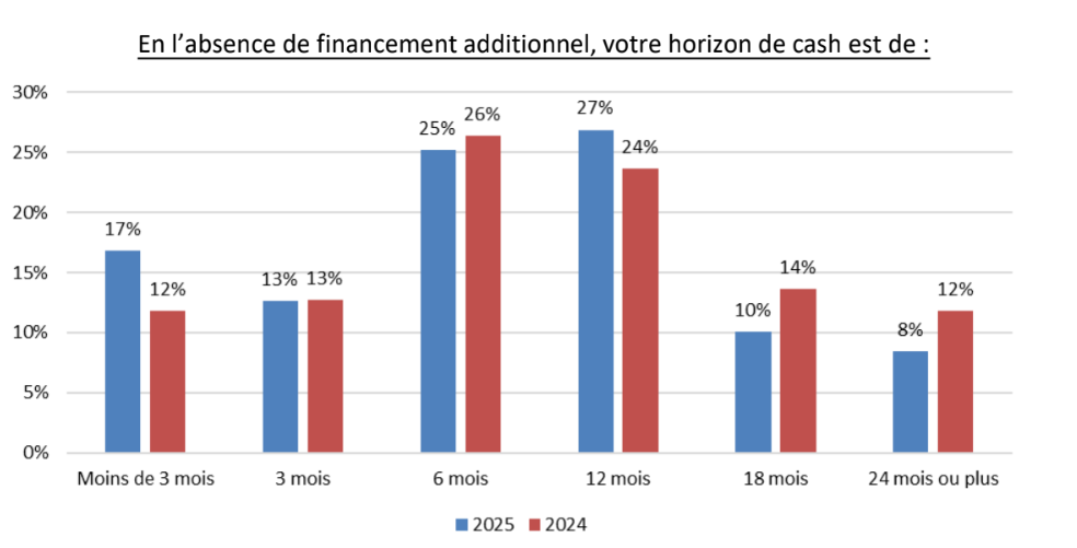 Accueil > Financement et politiques publiques > En 2025, la healthtech française toujours plus en mal de financements En 2025, la healthtech française toujours plus en mal de financements L'association France Biotech vient de révéler les résultats de son enquête portant sur la situation financière des acteurs de la filière healthtech. En 2025, les trois quarts des sociétés disent rencontrer des difficultés en matière de trésorerie et près d’un tiers d’entre elles ont un horizon de cash n’excédant pas le trimestre. Dans un contexte national et international marqué par les incertitudes, cette navigation à courte vue touche aussi les fonds d’investissement. Par Romain Bonfillon. Publié le 25 septembre 2025 à 17h08 - Mis à jour le 25 septembre 2025 à 17h22 Ressources France Biotech a présenté le 24 septembre un état des lieux de la situation financière des healthtech françaises. Ce dernier, dont c’est la 3e édition, a été réalisé à partir d’une enquête menée auprès de 123 entreprises adhérentes à France Biotech. Voici ses principaux enseignements. Une trésorerie très fragile 89% des entreprises se sentaient impactées par le contexte économique actuel et les trois quarts des sociétés disent rencontrer des difficultés en matière de trésorerie. Pour 29% de ces entreprises (25% en 2024), l’horizon de cash est même de trois mois ou moins. Les biotech (32%) sont légèrement plus concernées que les medtech et les entreprises du diagnostic (26%) par cette urgence, mais la situation des medtech s’aggrave puisqu’elle n’étaient que 15% en 2024 à disposer d’un horizon de trésorerie de 3 mois et moins. En moyenne, les acteurs de la healthtech ont cette année entre 6 et 12 mois de trésorerie. Logiquement, ce manque de fonds encourage la recherche de financement au travers d’une levée de fonds dilutive : ce sont 70% des 123 sociétés ayant répondu à l’enquête qui, en juillet 2025, déclaraient vouloir lever. Mais le contexte économique actuel est peu favorable (cf. encadré) et 79% des CFO et CEO en recherche de fonds disent rencontrer des difficultés pour financer leur entreprise. La nature des financements reçus Si 68% des entreprises (vs 61% en 2024) disent rencontrer des difficultés à obtenir des financements bancaires, les relations qu’elles ont avec leurs investisseurs actuels sont estimées comme “excellentes” pour 57% d’entre elles. L’inquiétude, cependant, est palpable, puisque 23% seulement des sociétés interrogées estiment qu’elles ont une santé financière meilleure qu’il y a un an, alors que 26 % la qualifient de “plus incertaine” et 16% de “très incertaine”. Les financements non dilutifs obtenus via des dispositifs nationaux ou européens demeurent, comme l’an dernier, très répandus (64% des 118 sociétés répondantes en ont perçu dans les 12 derniers mois). Aussi, le recours aux dispositifs de soutien et d’accompagnement de l’Etat est massif : 56% des sociétés bénéficient du statut de Jeune Entreprise Innovante (JEI) et 87% utilisent le Crédit Impôt Recherche (CIR). Ce dernier, rappelle France Biotech, est essentiel pour les PME innovantes, puisqu’il représente en moyenne chaque année entre 20 et 30% de leurs dépenses d’exploitation totales. Levées de fonds 2025 : les VC’s français à la peine Chaque année, France Digitale et EY publient leur baromètre annuel sur la performance économique et sociale des start-up et des fonds de capital-risque français. Les données relatives aux levées de fonds du premier semestre 2025 sont particulièrement inquiétantes, puisque les start-up françaises n’ont levé que 2,8 Mds € en six mois, soit une baisse de 35 % en valeur et de 24 % en volume par rapport à la même période l’an dernier. Cette tendance témoigne d’une double inquiétude, à la fois liée à l’instabilité politique en France et au contexte géopolitique et économique à l’international, notent en substance Maya Noël, directrice générale de France Digitale, et Franck Sebag, Managing Partner d’EY France, dans leur éditorial. “Dans un contexte où les perspectives de sortie se dégradent, les fonds adoptent une posture plus conservatrice, privilégiant le rétention de leurs actifs”, relève également l’étude, qui souligne qu’à l’échelle européenne, la France a cette année cédé sa place au profit de l’Allemagne, qui creuse l’écart avec 3,6 Mds € levés. Romain Bonfillon biotechfinancementFonds d'investissementHealthTechLevée de fondsmedtech Besoin d’informations complémentaires ? Contactez le service d’études à la demande de mind À lire Dossier Les TechBio françaises : le défi du financement Panorama France HealthTech : la filière reste dynamique malgré un contexte économique compliqué