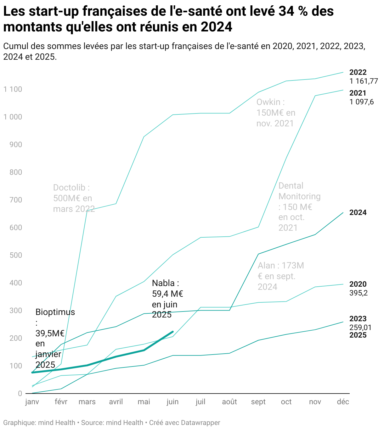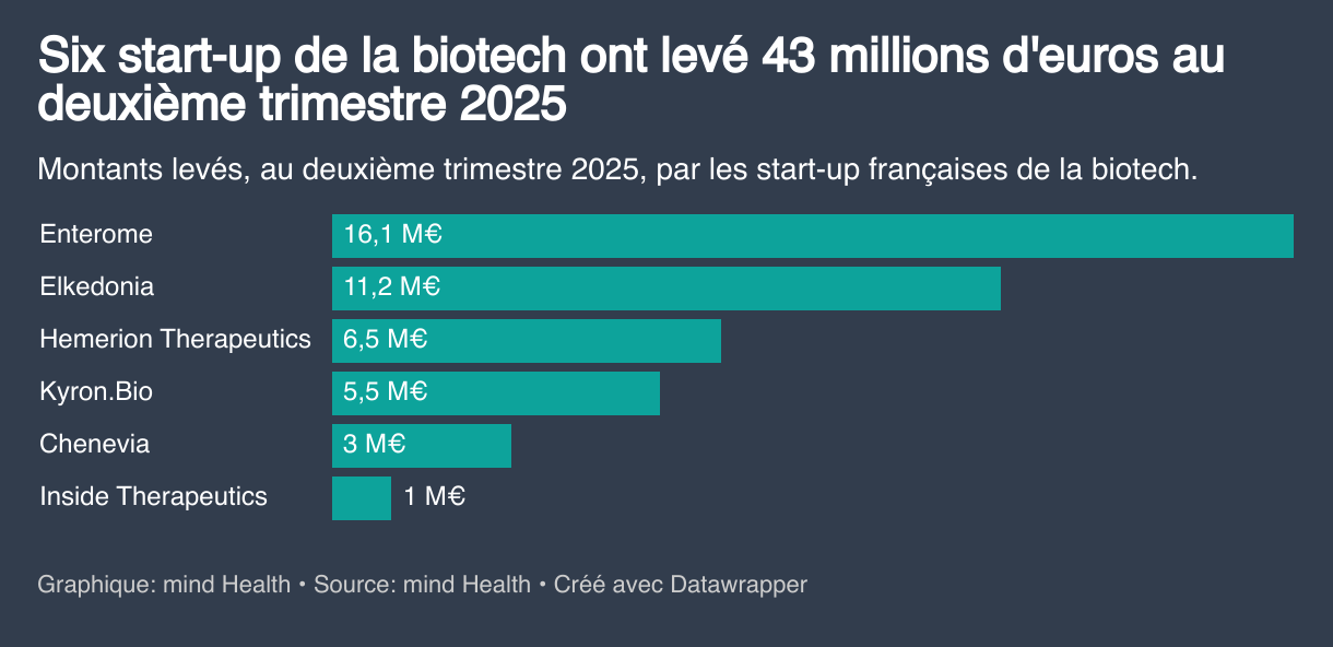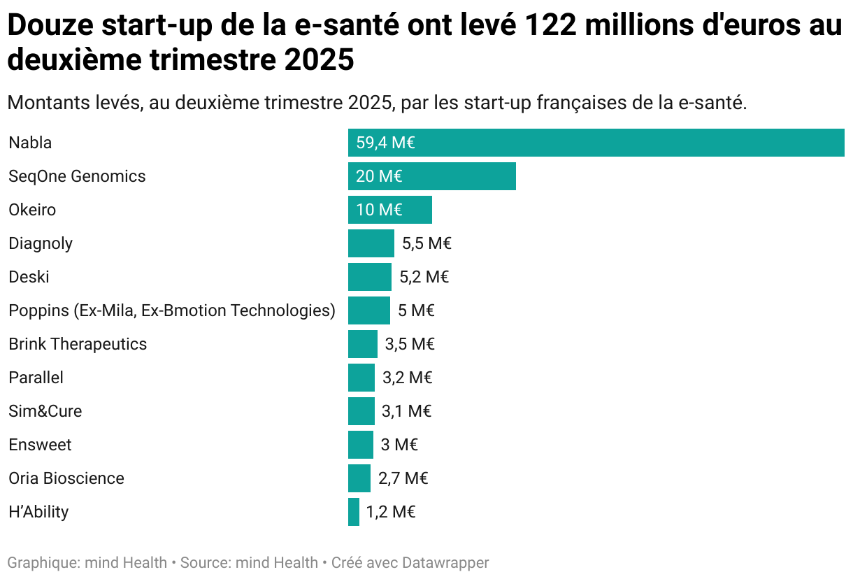 Accueil > Financement et politiques publiques > Les start-up françaises de la e-santé ont levé 122 millions d’euros au deuxième trimestre 2025 Les start-up françaises de la e-santé ont levé 122 millions d’euros au deuxième trimestre 2025 Douze start-up françaises de la e-santé ont levé des fonds au cours du trimestre écoulé, pour un montant total de 122 millions d'euros. mind Health en détaille la dynamique dans son baromètre. Par Coralie Baumard et Rudy Degardin. Publié le 15 juillet 2025 à 16h22 - Mis à jour le 15 juillet 2025 à 16h23 Ressources Avec 59 millions d’euros levés en juin auprès, notamment, de HV Capital et Highland Europe, Nabla compte pour 49 % du total des fonds levés par les start-up françaises de la e-santé au deuxième trimestre 2025. Le créateur d’un assistant d’IA ambiante pour les professionnels de santé a donc levé 100,2 millions d’euros, en quatre opérations, depuis sa création en 2018. SeqOne Genomics (plateforme d’analyse génomique basée sur l’IA) et Okeiro (plateforme d’aide à la décision clinique pour prévenir les défaillances d’organes) complètent le podium, avec respectivement 20 et 10 millions d’euros levés. En janvier 2022, SeqOne Genomics avait déjà réalisé un tour de table de 20 millions d’euros. Selon un communiqué, cette nouvelle levée de fonds doit lui permettre de s’imposer comme le “champion européen de l’analyse et de l’interprétation des données de séquençage nouvelle génération (NGS) pour le diagnostic clinique”. L’un de ses objectifs est d’intensifier sa présence aux États-Unis, amorcée au premier trimestre grâce à une plateforme dédiée. L’entreprise montpelliéraine a également annoncé son intention de poursuivre sa stratégie d’acquisitions ciblées, dont le rachat de Life & Soft a constitué un premier jalon. Okeiro a également en ligne de mire le marché américain. “Nous visons un déploiement à partir du troisième trimestre 2025. Notre algorithme est déjà qualifié par la FDA et nous travaillons sur la clearance de la plateforme logicielle d’ici la fin de l’année”, indiquait Pierrick Arnal, le PDG et cofondateur d’Okeiro, à mind Health en avril dernier. [Data] La liste des levées de fonds des start-up de l’e-santé Nabla lève 70 M$ pour construire sa plateforme d’agents d’IA Ce nouveau tour de table a été l’occasion pour Nabla de faire le point sur ses projets futurs. Alexandre Lebrun, son CEO, a indiqué dans un post de blog que l’entreprise construit une plateforme d’agents d’IA dédiés au domaine médical. Cette plateforme permettra aux établissements de santé et aux médecins de personnaliser les solutions de Nabla de documentation clinique, de codage médical et de dictée vocale ou de créer leurs propres agents afin d’optimiser leurs flux de travail. Ces nouveaux développements sont nécessaires alors que la concurrence est féroce sur le marché américain des solutions d’IA ambiante. La société américaine Abridge a levé 550 millions de dollars, lors de deux tours de table, afin d’ajouter de nouvelles fonctionnalités à sa plateforme d’IA ambiante. En juin 2025, elle revendiquait 150 clients. Dans son post, Alexandre Lebrun précise que la solution d’IA ambiante de Nabla est utilisée par 85 000 cliniciens dans plus de 130 établissements de santé aux États-Unis, dont CVS Health, l’Université de l’Iowa et Denver Health. Abridge n’est pas le seul concurrent de Nabla, Suki AI et Ambience Healthcare ont toutes les deux levé 70 millions de dollars en 2024. Microsoft, qui a lancé en mai dernier aux États-Unis son assistant d’IA Dragon Copilot, s’avère également un adversaire de taille. La start-up française a ciblé en priorité le marché américain car les groupements de systèmes hospitaliers acceptent volontiers de tester des solutions afin de réduire l’épuisement professionnel des praticiens comme l’expliquait Delphine Groll, cofondatrice et COO de Nabla, à mind Health en juillet 2024. Elle estimait que les deux prochaines années seront “décisives” pour se démarquer. Si le siège de Nabla ainsi que les équipes d’ingénieurs et d’experts en machine learning sont situées à Paris, ses initiatives commerciales restent pour le moment limitées en France. Nabla a notamment signé un partenariat avec l’éditeur Weda qui lui permet d’équiper 23 000 professionnels. Avec cette levée de fonds, l’entreprise entend accélérer sa présence sur le marché français, comme l’atteste son annonce pour recruter un directeur général France. La start-up devra là aussi composer avec d’autres sociétés comme PraxySanté et Tandem Health. 22 start-up ont levé des fonds au premier semestre 2025 Au total, douze entreprises du secteur ont levé des fonds au cours des trois mois écoulés. Au deuxième trimestre 2024, treize start-up avaient levé 74 millions d’euros. Cela porte à 22 le nombre de start-up qui ont levé des fonds depuis le début de l’année, pour un total de 223,7 millions d’euros, soit 34 % des montants levés en 2024. L’an dernier, à la même période, 33 start-up avaient réalisé une levée de fonds. La diminution du nombre de levées par rapport à 2024, déjà constatée sur les trois premiers mois de l’année, se poursuit au deuxième trimestre. Six biotech lèvent 43 millions d’euros Six biotechs ont levé des fonds au deuxième trimestre 2025, pour un montant total de 43 millions d’euros. L’entreprise parisienne Enterome est celle qui a levé le plus, avec 16,1 millions d’euros, auprès, notamment, de l’Institute for Follicular Lymphoma Innovation et de la société de capital-risque américaine SymBiosis. Enterome est spécialisée dans le développement d’immunothérapies pour traiter le cancer. Sur la seconde marche du podium avec plus de 11 millions d’euros récoltés, Elkedonia est la premièr