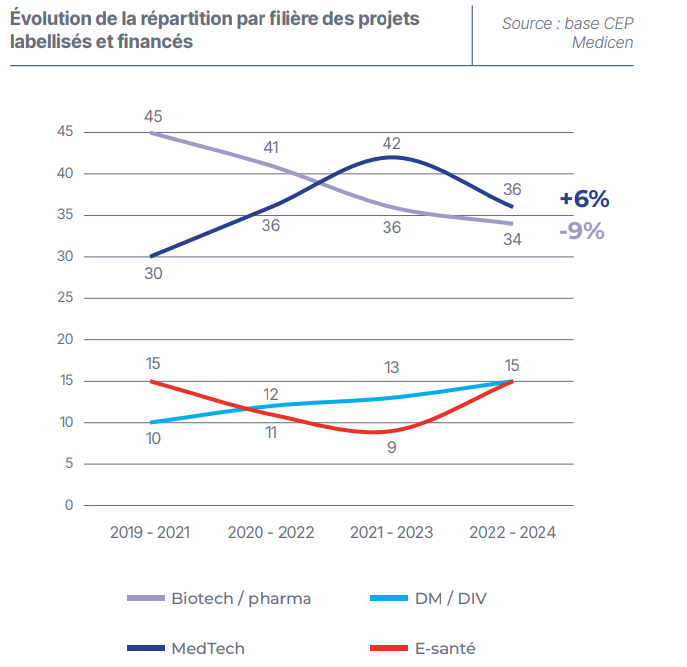 Accueil > Financement et politiques publiques > Médi’Scope 2025 : la filière santé se consolide, ses financements chutent Médi’Scope 2025 : la filière santé se consolide, ses financements chutent Le pôle de compétitivité Medicen a présenté le 1er octobre son Médi’Scope. Ce baromètre annuel, qui dresse un état des lieux des innovations santé franciliennes, révèle dans sa quatrième édition une consolidation et une maturation de la filière, dans un contexte financier difficile. Par Romain Bonfillon. Publié le 01 octobre 2025 à 12h19 - Mis à jour le 01 octobre 2025 à 17h40 Ressources Le financement des entreprises de l’innovation en santé L’édition 2025 du Medi’Scope note un fort ralentissement des financements privés en 2024 à l’échelle nationale. Si sur la période 2022-2024, la France reste le deuxième pays européen en termes de montants d’investissement privés (5 Mds €), une contraction sévère est constatée en 2024 avec -20% en nombre d’investissements et -36% sur les tickets moyens. Autre facteur d’inquiétude : la France est le seul pays d’Europe en décroissance sur ces tickets moyens, qui augmentent en moyenne de 23% sur les autres pays européens. La région francilienne n’échappe pas à cette dynamique baissière mais reste, en 2024, une locomotive européenne avec 480 M€ investis, derrière la région de Londres mais devant Zurich (367 M€) et Berlin (345 M€). En 2025, la healthtech française toujours plus en mal de financements L’oncologie et les biotechnologies comme domaines d’excellence L’oncologie reste la première indication des projets labellisés par Medicen (28) et financés par des investissements privés. Elle est suivie de près par la cardiologie (22) et la neurologie (16), deux aires thérapeutiques portées par le plan Smart Santé régional. L’Île-de-France, fait aussi valoir Medicen, est un pôle d’excellence en matière de biotechnologies puisque c’est la première région française en familles de brevets actifs en bioproduction (+ de 400). Quant à la dynamique provoquée par l’IA, le pôle de compétitivité francilien la qualifie d’exceptionnelle, rappelant que le marché français de l’IA en santé a un taux de croissance annuel composé (TCAC) de 38,8% sur la période courant de 2024 à 2030, année à laquelle il atteindrait 7,1 Mds $. Autre chiffre significatif : 450 start-up sont en France spécialisées dans le numérique et l’IA en santé (vs 225 il y a 4 ans). Un paysage contrasté selon les filières Le paysage de la healthtech révèle, en termes de nombre de projets soutenus par Medicen, des tendances variées : le nombre de projets en biotech et pharma s’érode (-9% entre la période 2019- 2021 et 2022-2024), à l’instar des projets medtech (cf. graphique ci-dessous). La e-santé connaît en revanche un rebond significatif même si, note Medicen, son taux de succès est très inférieur aux autres filières (20% vs 40%). Plus d’emplois mais moins d’établissements Après des années d’érosion, le cœur traditionnel de l’écosystème cesse de perdre des emplois et affiche +2% de croissance des effectifs entre 2023 et 2025. Avec +9% (+1 438 emplois), les activités purement pharmaceutiques portent la croissance du secteur traditionnel, compensant la stabilité relative des autres segments (dispositifs médicaux, commerce de gros). Mais, note Valérie Constanty, responsable étude à l’Institut Paris Région, “une baisse des effectifs a été constatée dans l’activité de recherche en biotechnologie. Elle doit être analysée avec précaution. Elle peut être réelle, s’expliquant par les difficultés que rencontrent les sociétés de biotechnologies à assurer leur développement (raréfaction des financements au niveau mondial, départs, modèle économique de ces thérapies) ou apparente, occasionnée par les phénomènes de rachats, fusions ou changement de code NAF. Une étude complémentaire avec un suivi pluriannuel est indispensable pour en proposer une interprétation correcte”. Aussi, note Medicen, la croissance globale des emplois “s’accompagne d’une réduction de 80 établissements, signe potentiellement d’une maturation par concentration et optimisation des structures”. Une filière en voie de structuration et de consolidation Un autre signe de la maturation de la filière healthtech se ressent dans la baisse des projets analysés chaque année par Medicen sur la période glissante de trois ans, avec un taux de financement de ces projets qui augmente. La région Île‑de‑France reste le deuxième opérateur des projets d’innovation en santé, derrière l’Agence nationale de la recherche (ANR), qui demeure le premier guichet de financement des projets, à fois en nombre de projets comme en taux de succès (45%). L’écosystème santé francilien en chiffres 92 300 emplois recensés dans 2 150 établissements +2% de croissance des effectifs entre 2023-2025 malgré une baisse du nombre d’établissements (- 80) 47% des emplois concentrés dans les ETI (250-1 999 salariés). L’Île de France représente la deuxième région européenne en termes d’investissements en santé (3 Mds €, soit 58,7% des investissements à l’échelle nationale). Romain Bonfillon FinancementsInnovationpôle de compétitivitéstart-up Besoin d’informations complémentaires ? Contactez le service d’études à la demande de mind
