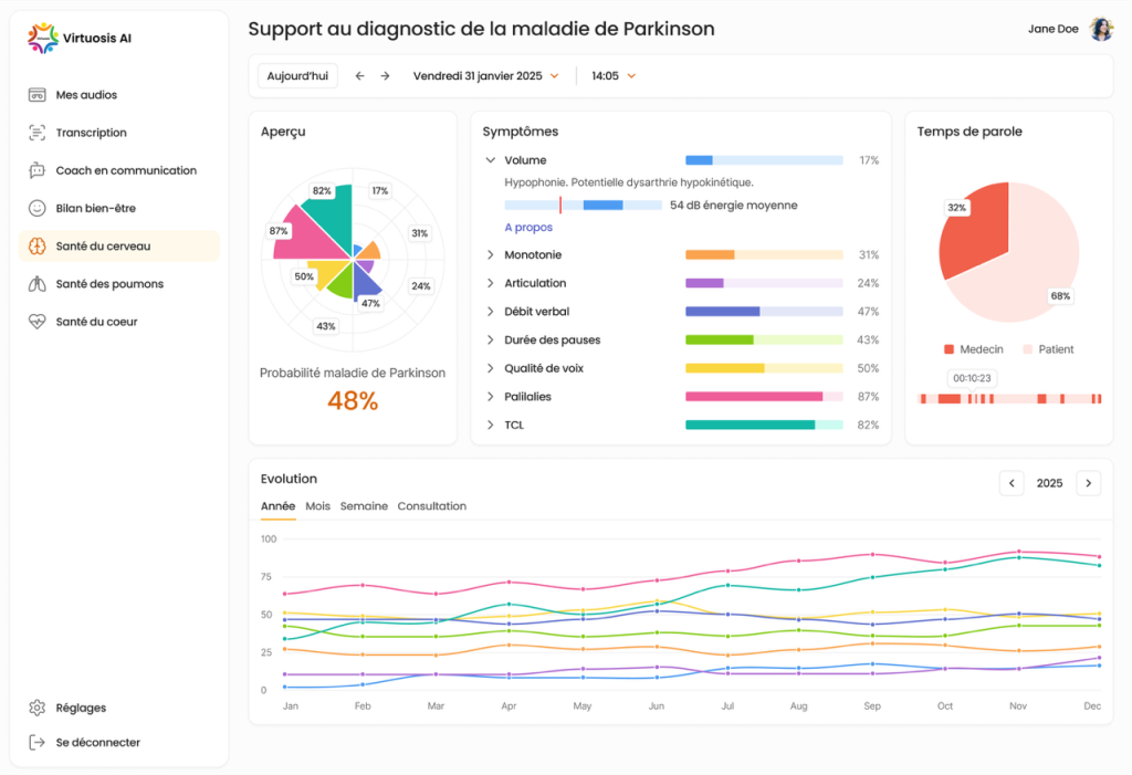 Accueil > Industrie > Biomarqueurs vocaux, la détection à portée de voix Biomarqueurs vocaux, la détection à portée de voix Avec le développement de l’intelligence artificielle, les biomarqueurs vocaux prennent leur essor. Ces caractéristiques ou combinaisons de caractéristiques de la voix associées à un résultat clinique deviennent des outils pour le diagnostic ou le suivi de pathologies et l’évaluation de l’efficacité d’un traitement. Par Coralie Baumard. Publié le 01 avril 2025 à 12h22 - Mis à jour le 02 avril 2025 à 11h10 Ressources Le marché mondial des biomarqueurs vocaux se chiffrera à 3,37 milliards de dollars en 2025, contre 2,84 milliards en 2024, selon un rapport de la société d’études de marché, The Business Research Company, publié en janvier 2025. Il connaîtra un taux annuel de croissance composé de 18,6% et devrait atteindre 6,66 milliards de dollars en 2029. Un biomarqueur vocal est une caractéristique ou une combinaison de caractéristiques du signal audio de la voix associée à un résultat clinique. “La recherche sur les biomarqueurs vocaux a vraiment explosé pendant la pandémie du Covid-19, explique le Dr Guy Fagherazzi, directeur du département Santé de précision au Luxembourg Institute of Health et spécialiste de la question. Mais nous savons depuis une trentaine d’années que les pathologies ont des conséquences sur la manière de produire la voix et impactent la voix des patients. Par exemple, pour les neurologues, la voix des personnes atteintes de Parkinson est un indicateur de progression de la maladie.” Un accès généralisé aux smartphones ainsi qu’à des micros de bonne qualité et le développement de l’intelligence artificielle permet désormais leur essor. Dr Guy Fagherazzi, directeur du département Santé de précision au Luxembourg Institute of Health “Le potentiel des biomarqueurs vocaux est multiple. En premier lieu, ils peuvent constituer des digital clinical endpoints, des informations, des marqueurs suivis pour démontrer l’efficacité d’un traitement ou d’une intervention dans un essai clinique, précise le Dr Guy Fagherazzi. Ils peuvent également permettre la tenue de consultations augmentées, qu’il s’agisse de consultations face-à-face ou de téléconsultation, avec une analyse de la voix en temps réel ou quasi en temps réel. À partir d’enregistrements, nous pouvons recueillir de nombreux indicateurs sur différents paramètres de santé.” La santé mentale, point d’entrée des start-up Pour le Dr Guy Fagherazzi, les grands domaines d’application des biomarqueurs vocaux sont les maladies neurodégénératives comme Parkinson et Alzheimer, la santé mentale (symptômes dépressifs, dépression, troubles bipolaires, stress, anxiété) ainsi que les maladies respiratoires (asthme, BPCO). La santé mentale est la spécialité la plus explorée par les start-up. La start-up Virtuosis AI, spin-off de l’Ecole Polytechnique Fédérale de Lausanne, a bénéficié de l’intérêt grandissant des entreprises pour la santé mentale de leurs salariés dans la période post-Covid. Fondée en 2022 par Lara Gervaise et Edoardo Giudice, elle s’appuie sur les recherches de cette dernière axées sur l’utilisation de l’intelligence artificielle pour améliorer la communication. Approchée par Microsoft, la start-up a développé une solution de détection du burn-out en entreprise, basée sur des modèles d’intelligence artificielle propriétaires, en se fondant sur l’analyse du stress, de l’anxiété et de la fatigue via la voix. Intégrée à Teams, l’application de visioconférence du géant américain, la solution est officiellement lancée en janvier 2023 au Consumer Electronic Show de Las Vegas. “Nous avons eu beaucoup de demandes de personnes souhaitant tester leur état mental, nous avons donc ouvert au grand public une application à la mi-mars 2025”, confie la cofondatrice de Virtuosis AI à mind Health. Aperçu de l’interface de la solution de Virtuosis AI dédiée à la maladie de Parkinson. L’entreprise a également entamé des collaborations avec des hôpitaux, notamment les Hôpitaux universitaires de Genève et l’hôpital d’Ottawa afin d’obtenir des données pour valider ses solutions sur la santé mentale et cognitive (Alzheimer, Parkinson, trouble cognitif léger) et développer la technologie sur de nouvelles pathologies. Lara Gervaise, cofondatrice de Virtuosis AI. “En 2025, nous mettons en place des projets d’études en France, notamment avec la fondation Fondamentale, l’AP-HP et des CHU en régions ainsi que la médecine de ville sur la thématique de la santé mentale (stress, anxiété, dépression) afin d’obtenir des validations cliniques et médico-économiques nécessaires au remboursement de notre solution”, annonce Lara Gervaise. La start-up, basée à Lausanne, a ouvert des bureaux en France en janvier 2025. Pour sa solution, Virtuosis AI dispose d’un marquage CE de classe I et prépare son passage en classe IIa. Développer un modèle de fondation basé sur la voix La start-up française Callyope explore également le potentiel de la voix dans le domaine de la santé mentale. L’entreprise, qui a levé 2,2 millions d’euros en 2023, a élaboré une plateforme permettant à des patients atteints de troubles bipolaires, de dépression sévère ou de schizophrénie de suivre leurs symptômes et d’envoyer des alertes à leur psychiatre en cas de rechute. La start-up a besoin d’un échantillon d’une minute de conversation spontanée pour réaliser son analyse. “La voix est le médium d’analyse le plus riche en psychiatrie. Pour diagnostiquer une schizophrénie, l’un des symptômes est le désordre du discours. Pour les troubles bipolaires, le psychiatre s’appuie, notamment sur l’accélération du débit de parole dans les phases maniaques”, indique Martin Denais, CEO de Callyope. La start-up d