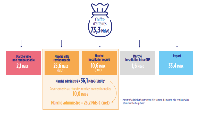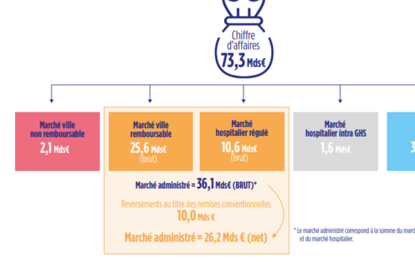 Après déduction des remises et de la clause de sauvegarde, le chiffre d’affaires net des médicaments du marché régulé s’élève à 26,2 milliards d’euros.