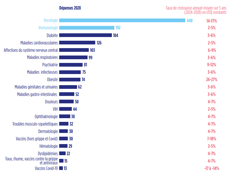 Estimation des 20 aires thérapeutiques principales en 2028. Source : Bilan économique des entreprises du médicament – Édition 2024 du Leem