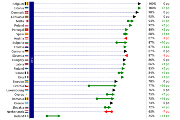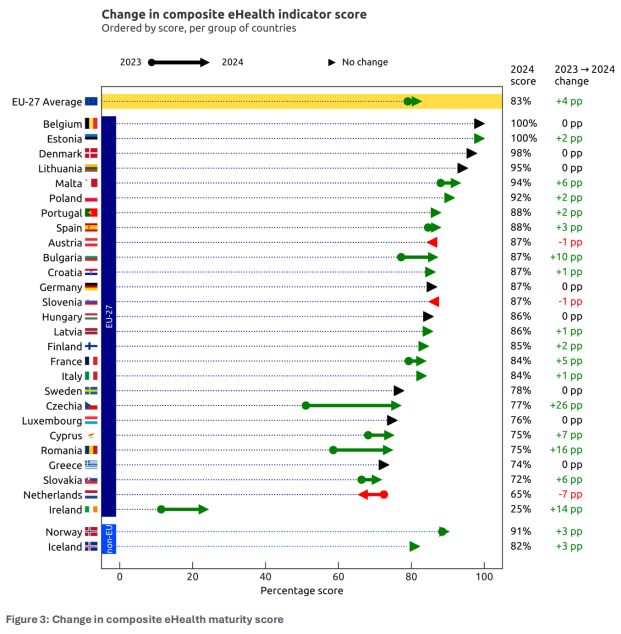Accueil > Parcours de soins > Santé numérique : des indicateurs de maturité en hausse en Europe Santé numérique : des indicateurs de maturité en hausse en Europe Un rapport publié par la Commission européenne présente pour la troisième année consécutive les scores de maturité en e-santé dans les pays de l’Union européenne. En 2024, le score moyen de maturité des pays de l’Union européenne est de 83%, contre 79% en 2023. Par Clarisse Treilles. Publié le 11 juillet 2025 à 11h14 - Mis à jour le 11 juillet 2025 à 11h14 Ressources En 2024, 16 États membres de l’UE ont amélioré leurs services numériques en matière de santé. Trois, en revanche, ont vu leur score diminuer et huit sont restés inchangés. La Belgique et l’Estonie figurent toujours en tête du classement, avec un score composite de maturité de 100% chacun. Le Danemark (98%), la Lituanie (95%), Malte (94%), la Pologne (92%) et la Norvège (91%) font également partie des pays ayant les meilleurs résultats. Ces chiffres sont tirés d’un rapport faisant le point sur le niveau de maturité en matière de e-santé des 27 pays de l’Union européenne ainsi que de l’Islande et de la Norvège. La France gagne 5 points par rapport à 2023 Occupant la 17e place du classement, la France affiche, elle, un score de 84% (+5 points sur un an), légèrement supérieur à la moyenne européenne (83%). Avec l’Allemagne (87%), à la 12e place, la France fait partie des pays “en voie de développement rapide”, selon le rapport. Trois ans après la création de Mon espace santé, 18 millions de Français ont activé leur espace numérique personnel, soit 25% de la population française. Plus d’un document sur deux qui est produit en France est envoyé au patient dans son espace numérique de santé. Les points de friction sont encore nombreux, à commencer par le gouffre entre la médecine de ville et l’hôpital pour l’accès et le partage des dossiers médicaux. Après l’entrée en vigueur du règlement relatif à l’Espace européen des données de santé (EHDS) cette année, le ministère de la Santé a présenté début juillet une stratégie sur l’IA et l’usage secondaire des données de santé. D’ici 2029, la France devra mettre en place un catalogue national des ensembles de données, qui référence l’ensemble des bases de données existantes permettant la réutilisation des données. Si le Health Data Hub a déjà développé un répertoire de bases de données du SNDS, des travaux sont en cours avec la CNIL pour que ce répertoire cible toutes les bases sur les données de santé visées par le règlement. Les images et les DM toujours peu disponibles Vingt-trois États membres (85 %) indiquent que 80 à 100 % de la population nationale est techniquement en mesure d’accéder à son dossier médical électronique via le service d’accès fourni. Comme l’an dernier, quatre pays déclarent disposer de services régionaux (Irlande, Italie, Espagne et Suède). D’année en année, “davantage de types de données sont disponibles et davantage de prestataires de soins de santé sont connectés et partagent leurs données” observe le rapport. Néanmoins, les scores de maturité des pays révèlent des écarts dans l’accès par les citoyens à leurs données de santé en ligne. Parmi les 13 types de données de santé étudiés dans le cadre de cette méthodologie, certains types de données, notamment les images médicales et les dispositifs médicaux, restent peu disponibles. Cette lacune avait déjà été identifiée dans le rapport de l’année précédente. Les laboratoires d’imagerie, par exemple, sont loin d’avoir tous achevé leur numérisation, comme en témoignait une étude de décembre dernier publiée par Owkin. La majeure partie des pathologistes continue à utiliser exclusivement le microscope pour étudier les lames issues des biopsies. Clarisse Treilles Dispositif médicalDonnées de santéEuropeHôpitalOutils numériquessanté numérique Besoin d’informations complémentaires ? Contactez le service d’études à la demande de mind