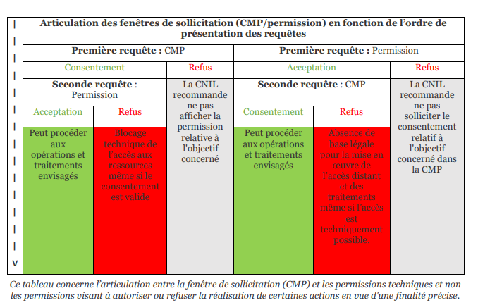 Deux points que la Cnil a pris en compte en précisant dans ses recommandations que le mécanisme de scoring devrait être exercé par un tiers – dont elle ne précise pas la nature -, et “reposer sur une méthodologie préalablement définie, de manière transparente”. La Cnil a également précisé l’articulation des fenêtres de sollicitation (CMP et permissions techniques), en partant du principe de cibler “les permissions dites ‘techniques’, conçues par les fournisseurs d’OS […], indépendamment des finalités pour lesquelles elles pourraient être utilisées”. Ce mécanisme étant plutôt simple à mettre en place selon Jérôme Perani, chief revenue officer du fournisseur de CMP Axeptio : “Tout ça est fait en lien avec les éditeurs, ce n’est pas la CMP qui prend le contrôle des permissions techniques”.