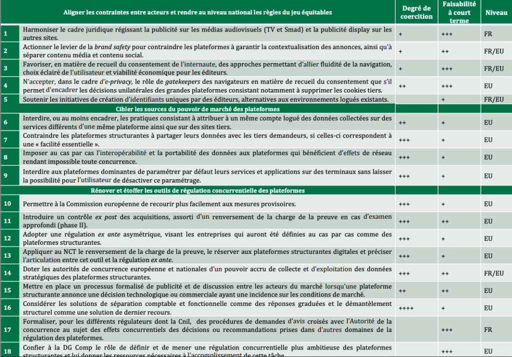 Les auteurs du rapport soulignent que l’arsenal de régulation existant « doit être étoffé et rénové », notamment dans les compétences des organes de régulation. C’est ici l’un des griefs principaux des acteurs locaux des médias et de la publicité : les mécanismes actuels d’intervention du régulateur serait trop actuellement trop lents, trop complexes et inadaptés sur le numérique, particulièrement pour répondre aux conséquences immédiates causées par les abus de position dominante de Google et Facebook.