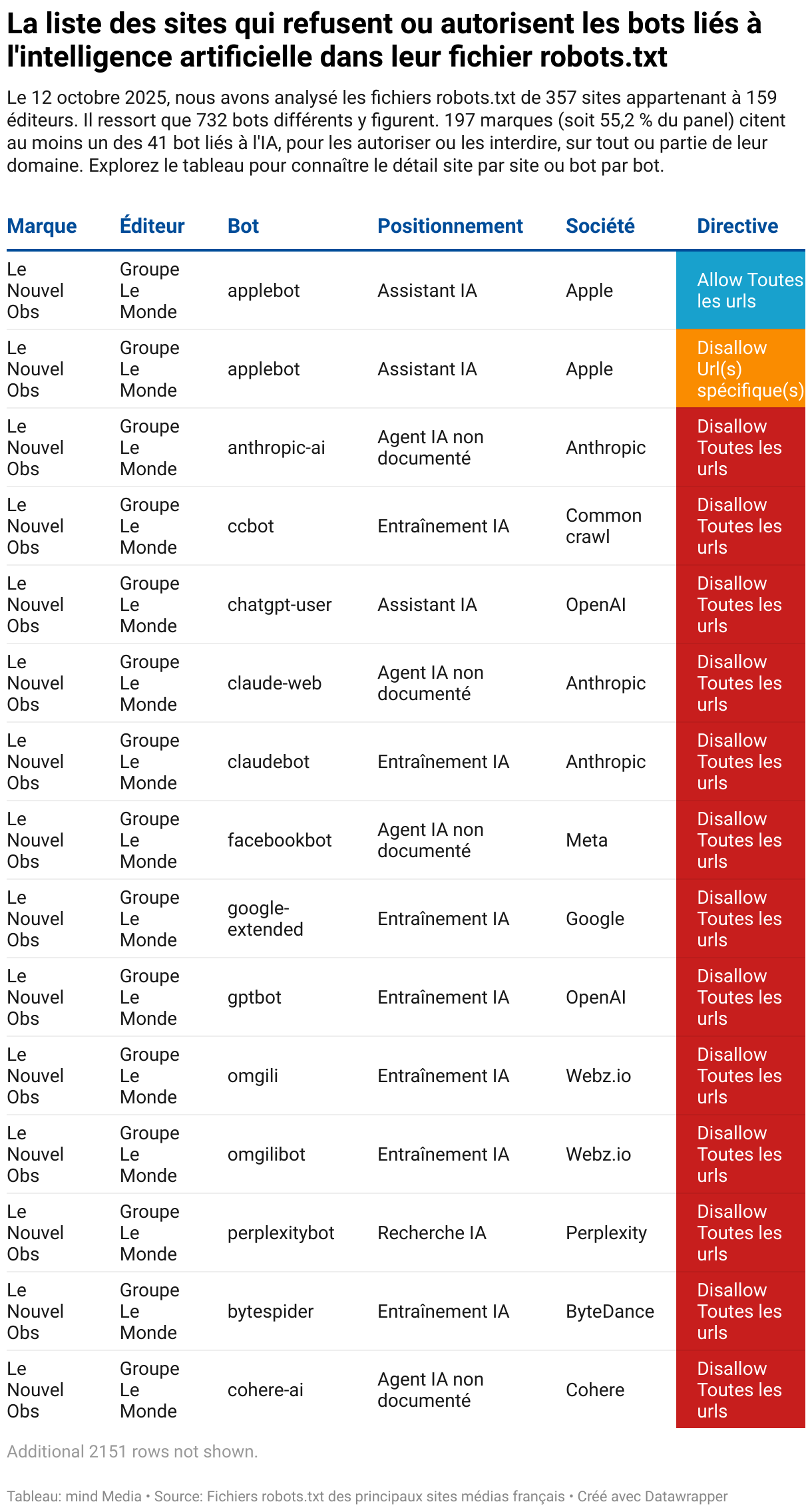 Accueil > Data > Initiatives & panoramas > Opt-out : quels éditeurs français interdisent les robots crawlers de l’IA générative ? Opt-out : quels éditeurs français interdisent les robots crawlers de l’IA générative ? Pour faire valoir leurs droits face aux acteurs de l’intelligence artificielle générative, de nombreux éditeurs français ont choisi de leur signifier leur refus d'accès ou de préciser leur position via le TDM Reservation Protocol. mind Media surveille les fichiers robots.txt de plusieurs centaines de sites d’environ 150 éditeurs français majeurs. Consultez les listes dans nos tableaux mis à jour quotidiennement. Par Aymeric Marolleau et Paul Roy. Publié le 02 octobre 2023 à 16h59 - Mis à jour le 19 septembre 2025 à 17h17 Ressources Pour entraîner leurs grands modèles de langage (LLM), les fournisseurs d’outils d’intelligence artificielle générative ont besoin de collecter des contenus du web, notamment des articles d’information. Selon une étude publiée en 2021, la moitié du top 20 des sources du corpus anglais de Common Crawl, sur lequel se sont appuyés Open AI et Google, est composée de sites de presse – New York Times, LA Times, Forbes, HuffPost, etc. Les éditeurs s’en inquiètent et font valoir leurs droits, notamment en appliquant, pour certains, le droit d’opposition (opt-out) prévu par les articles 3 et 4 (exception TDM, pour “Text and Data Mining”) de la directive européenne de 2019 sur le droit d’auteur et les droits voisins. En août 2023, OpenAI a présenté GPTBot et ChatGPT-User, deux crawlers destinés à enrichir ses modèles. Google, qui développe Bard et Vertex AI, a fait de même le 28 septembre 2023 avec Google-Extended. En permettant une identification claire de leurs robots, ces sociétés donnent la possibilité aux éditeurs de les bloquer s’ils ne souhaitent pas voir leurs contenus exploités : il leur suffit d’ajouter une instruction sur leurs fichiers robots.txt (voir méthodologie). Depuis, le nombre de sociétés qui entraînent des modèles d’IA ou qui proposent des assistants ou des “moteurs de réponse” s’appuyant sur cette technologie, a considérablement augmenté, et avec elles le nombre de robots qui convoitent les contenus des éditeurs (images, articles, vidéos…). Depuis fin août 2023, mind Media surveille une fois par jour les fichiers robots.txt d’un peu plus de 300 sites pour savoir s’ils interdisent leurs contenus aux bots des acteurs de l’IA générative. Le laboratoire de développement EDRLab, installé à Paris, a créé un protocole dédié à permettre plus de finesse dans le contrôle des droits, dans un langage lisible par machine, face aux pratiques de récupération de données et de texte. Baptisé TDM Reservation Protocol (TDMRep) – où “TDM” est une contraction de “text and data mining” – il permet aux éditeurs d’indiquer si les droits de contenus web spécifiques sont réservés, comment ils souhaitent être contactés, et le cas échéant quelle licence peut être appliquée. En pratique, cela passe par l’ajout d’instructions dans le code HTML ou l’en-tête HTTP de leur site, ou sur un fichier json hébergé sur leurs serveurs (voir méthodologie). En France, Le Geste recommande à ses membres l’utilisation de ce protocole. Depuis fin septembre 2023, nous surveillons près de 400 sites d’éditeurs français majeurs pour savoir s’ils ont adopté TDMRep. Ci-dessous, consultez la liste de ceux qui ont pris cette décision : Pour aller plus loin, lisez nos analyses sur ce sujet : Août 2023 : Plus d’une vingtaine d’éditeurs d’information français bloquent le robot crawler de ChatGPT ou Google sur leurs sites Septembre 2023 : Google précise à son tour comment bloquer ses crawlers Décembre 2024 : IA, veille, publicité, agrégation de contenus… Quels sont les robots crawlers que les éditeurs français bloquent ou autorisent sur leurs sites ? Décembre 2024 : Quelle est la stratégie des éditeurs vis-à-vis des robots crawlers ? Juin 2025 : Quels sont les robots des acteurs de l’intelligence artificielle qui convoitent les contenus des éditeurs ? Juillet 2025 : Face aux robots crawlers de l’IA, la réponse au cas par cas des éditeurs Méthodologie Robots.txt La cellule datajournalisme du groupe mind a développé pour mind Media un script qui recherche la présence d’un fichier robots.txt sur près de 400 URL d’un panel constitué des principaux sites médias français (PQN, PQR, TV, radio…). Tous ces sites ne disposent pas d’un fichier robots.txt, ou certains peuvent avoir bloqué notre requête. Une fois le fichier robots.txt récupéré, nous y recherchons la présence de la directive “Disallow” concernant les bots d’OpenAI, GPTBot et ChatGPT-User (utilisé par les plug-ins de ChatGPT). Le 28 septembre, Google a présenté dans un post de blog Google Extended, un dispositif qui permet aux éditeurs d’indiquer s’ils souhaitent ou non autoriser la récupération de leurs contenus pour l’amélioration de Bard et Vertex AI, ses IA génératives. Nous avons commencé à rechercher sa présence, associée à la directive “Disallow”, dans les fichiers robots.txt le 29 septembre. Il est possible que certains éditeurs bloquent les bots d’OpenAI ou de Google par d’autres moyens que leur fichier robots.txt, par exemple à l’aide de gestionnaires de bots, comme Bot Manager, d’Akamai, ou DataDome. TDM Reservation Protocol Pour signifier aux solutions d’IA génératives qu’ils restreignent l’accès à leurs contenus, les éditeurs peuvent aussi avoir recours au protocole TDMRep, proposé par l’European digital reading lab (EDRLab). Depuis le 29 septembre, nous vérifions sa présence dans les codes HTML, l’en-tête HTTP ou dans un fichier json hébergé sur les serveurs des sites de notre panel. CGV Les directives sur les fichiers robots.txt et TDM Reservation Protoco