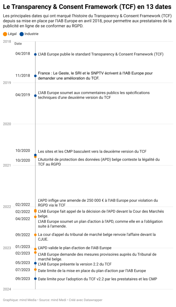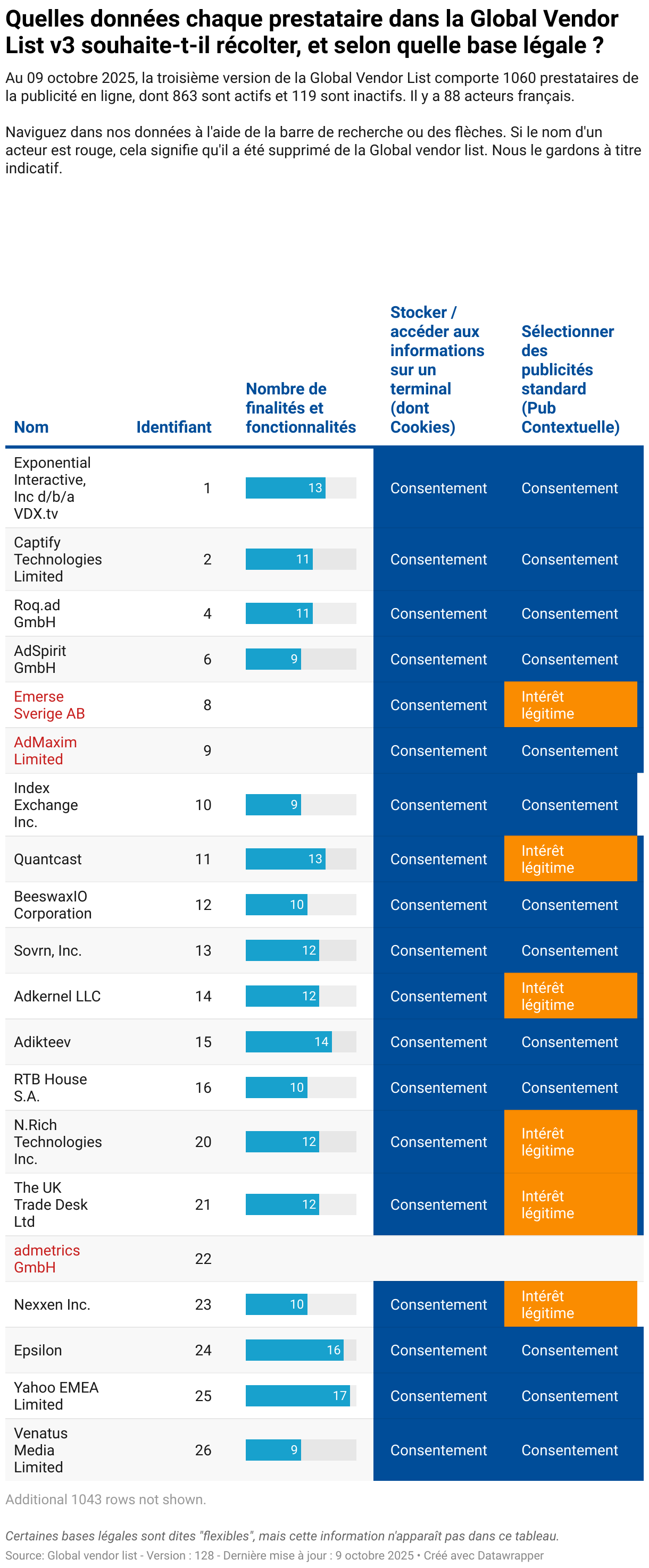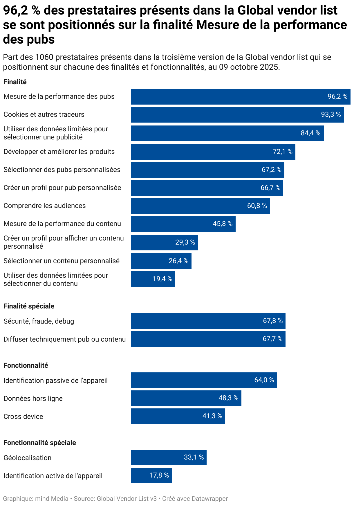 Accueil > Data > Initiatives & panoramas > Les données récoltées par les acteurs de la publicité en ligne Les données récoltées par les acteurs de la publicité en ligne Depuis mai 2018, les acteurs de la publicité en ligne sont appellés par l'IAB Europe à renseigner, dans la Global Vendor List (GVL), les données qu'il collectent sur les sites des éditeurs, comment ils les utilisent (cross device, géolocalisation...), et la base légale (consentement ou intérêt légitime) qu'ils revendiquent. Prestataire par prestataire, retrouvez toutes ces informations dans nos tableaux et les graphiques qui les accompagnent, mis à jour chaque semaine avec la dernière version de la GVL. Par Sara Chaouki et Aymeric Marolleau. Publié le 11 juillet 2025 à 15h50 - Mis à jour le 11 juillet 2025 à 15h50 Ressources Les acteurs de la publicité en ligne qui interviennent en Europe s’astreignent à indiquer à l’IAB Europe le type de données qu’ils collectent, via la Global Vendor List du Transparency & consent framework (TCF). Depuis 2018, la cellule datajournalisme du groupe mind analyse régulièrement ces données : quels acteurs se positionnent sur l’ensemble des finalités prévues par le framework, du stockage de cookies au reporting publicitaire en passant par la personnalisation ? Lesquels se positionnent sur l’ensemble des fonctionnalités, du matching de données offline à la géolocalisation en passant par le cross-device ? Le 16 mai 2023, pour prendre en compte l’évolution de la jurisprudence et des recommandations des autorités de protection des données, l’IAB Europe a annoncé dans un communiqué le lancement d’une nouvelle version du Transparency & Consent Framework (TCF v2.2). Les prestataires de la publicité en ligne et les CMP ont jusqu’au 30 septembre pour s’y conformer, notamment en intégrant la troisième version de la Global Vendor List. A partir du printemps 2023, nous avons donc aussi récupéré et analysé les données contenues dans la troisième version de la GVL : Lisez aussi les analyses que nous avons tirées de ces données : Novembre 2023 : Quels sont les enseignements du passage à la V2.2 ? Juin 2023 : TCF v2.2 : quelles implications pour les prestataires, CMP et éditeurs ? Mars 2021 : Quelles données les acteurs de la publicité en ligne collectent-ils en 2021 ? Août 2019 : Quelles données les acteurs de la publicité en ligne recueillent-ils 15 mois après l’entrée en application du RGPD ? Janvier 2019 : Quelles données les acteurs français de la publicité en ligne recueillent-ils fin 2018 ? Juin 2018 : Quelles données les acteurs français de la publicité en ligne recueillent-ils ? Juin 2018 : L’intérêt légitime invoqué par des acteurs publicitaires pour se passer du consentement des internautes Qu’est ce que la Global Vendor List ? En réponse au RGPD, entré en vigueur en mai 2018, l’Internet Advertising Bureau (IAB) Europe a introduit le Transparency & Consent Framework (TCF) en avril 2018 afin d’encadrer le recueil du consentement internaute et sa transmission à travers l’ensemble de la chaîne publicitaire. Critiqué par certains éditeurs et certaines sociétés adtech, le TCF a fait l’objet d’une deuxième version, mise en œuvre officiellement le 15 août 2020, puis d’une version “2.2”, dévoilée en mai 2023. Le TCF se compose notamment d’un fichier, accessible publiquement et baptisé Global Vendor List (GVL), sur lequel les prestataires de la publicité en ligne déclarent les finalités pour lesquelles ils récoltent des données – créer un profil utilisateur, identifier sa géolocalisation ou son terminal… – et la base légale sur laquelle ils s’appuient pour chacune d’elles – consentement ou intérêt légitime. La deuxième version du TCF a clarifié et assouplit les finalités et fonctionnalités déclarées par les prestataires, puisque le nombre de finalités est passé de cinq à 12 (dix finalités plus deux finalités spéciales), et celui des fonctionnalités de trois à cinq (trois fonctionnalités plus deux fonctionnalités spéciales). Chacune d’elles est désignée par un nom, une description vulgarisée et une description juridique. Pour plus de clarté, nous avons parfois modifié ou simplifié leur appellation (voir l’encadré définitions en fin d’article). La version 2.2 du TCF a introduit une troisième version de la Global Vendor List, que les prestataires ont rejoint à partir de mai 2023. Entre autres changements, l’intérêt légitime ne peut plus être invoqué pour les finalités trois à six, celles liées à la création de profils personnalisés pour une publicité ou un contenu, et la sélection d’une publicité ou d’un contenu personnalisé. Pour rappel, l’autorité de protection des données (APD) belge a infligé une amende de 250 000 euros à l’IAB Europe en février 2022 pour violation du RGPD via le TCF. L’association professionnelle a fait appel de cette décision, et la Cour de justice de l’Union européenne (CJUE) a été saisie du litige en septembre 2022. En avril de la même année, l’IAB Europe a soumis un plan d’action à l’ADP belge, qui l’a validé en janvier 2023, donnant six mois à l’association – soit jusqu’au 11 juillet – pour le mettre en place. Sara Chaouki et Aymeric Marolleau Besoin d’informations complémentaires ? Contactez le service d’études à la demande de mind À lire Dossiers RGPD : quelles données les acteurs français de la publicité en ligne recueillent-ils fin 2018 ? Dossiers RGPD : quelles données les acteurs français de la publicité en ligne recueillent-ils ?