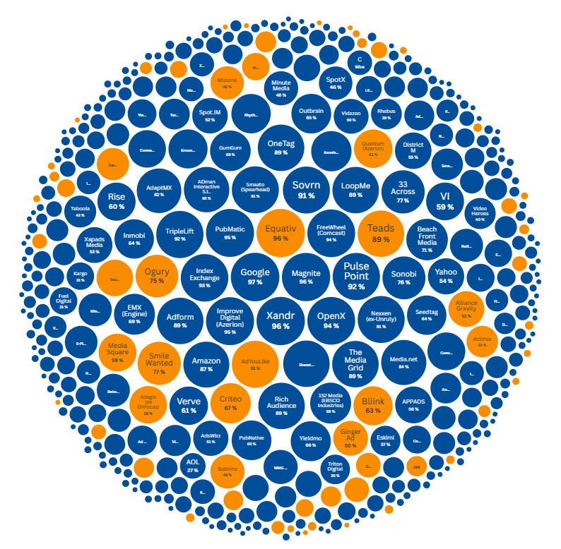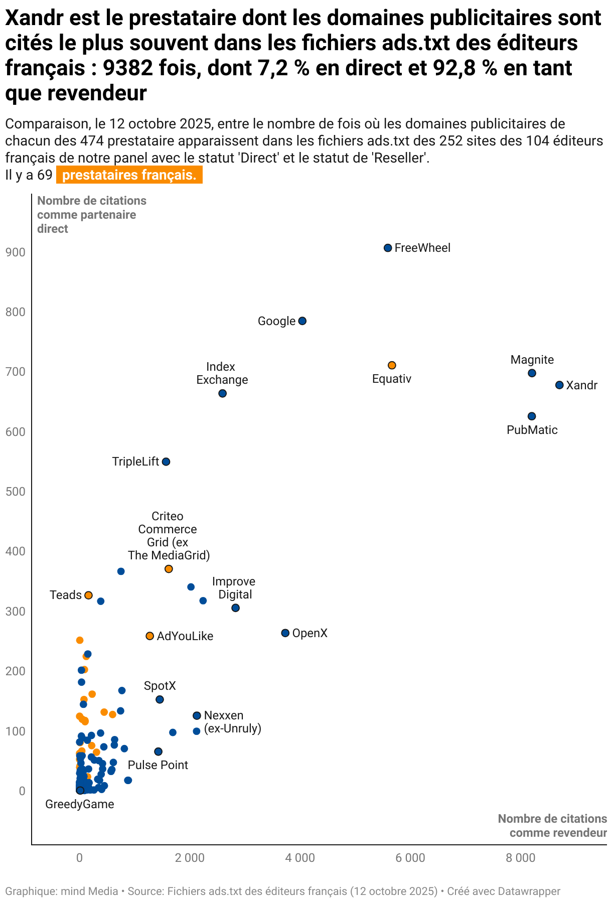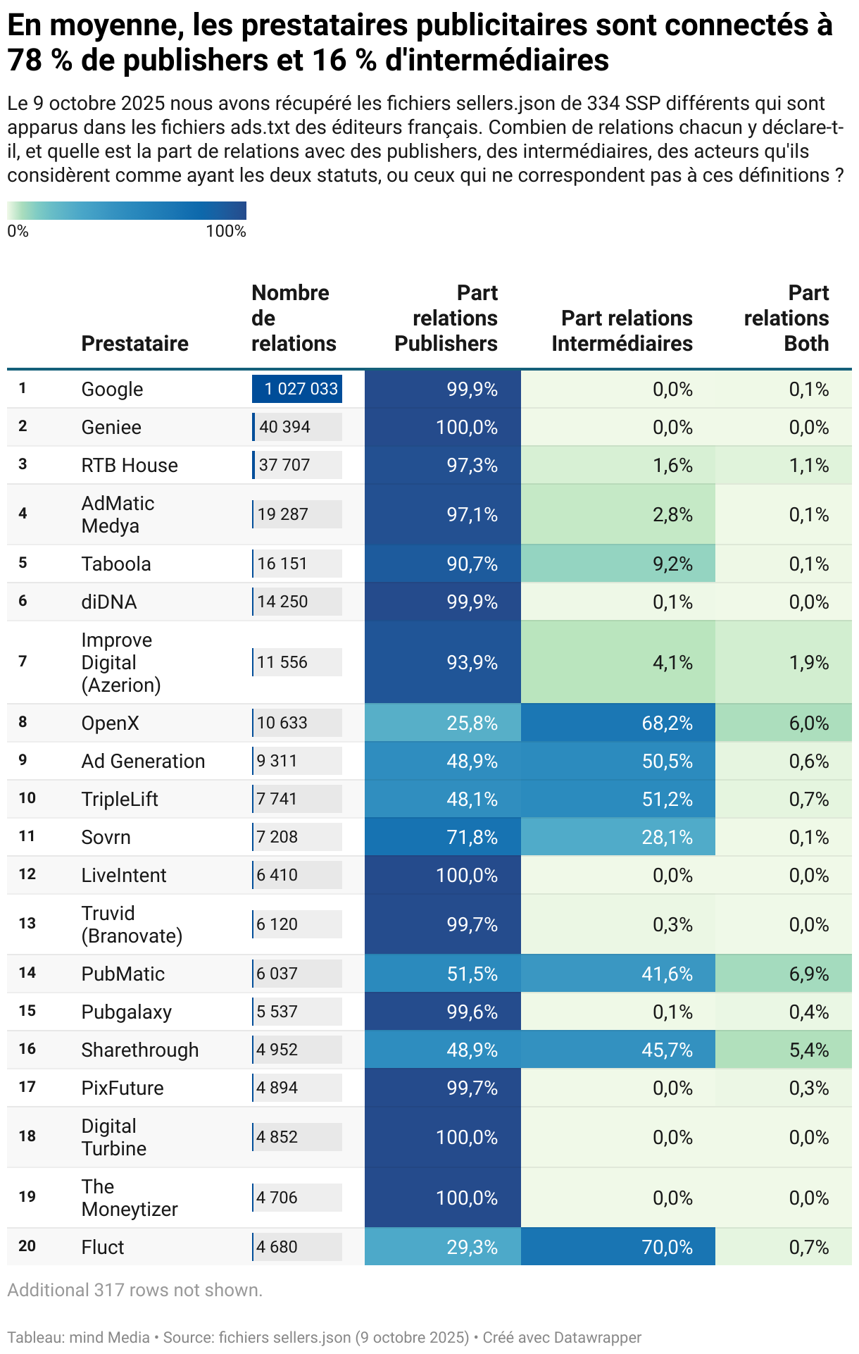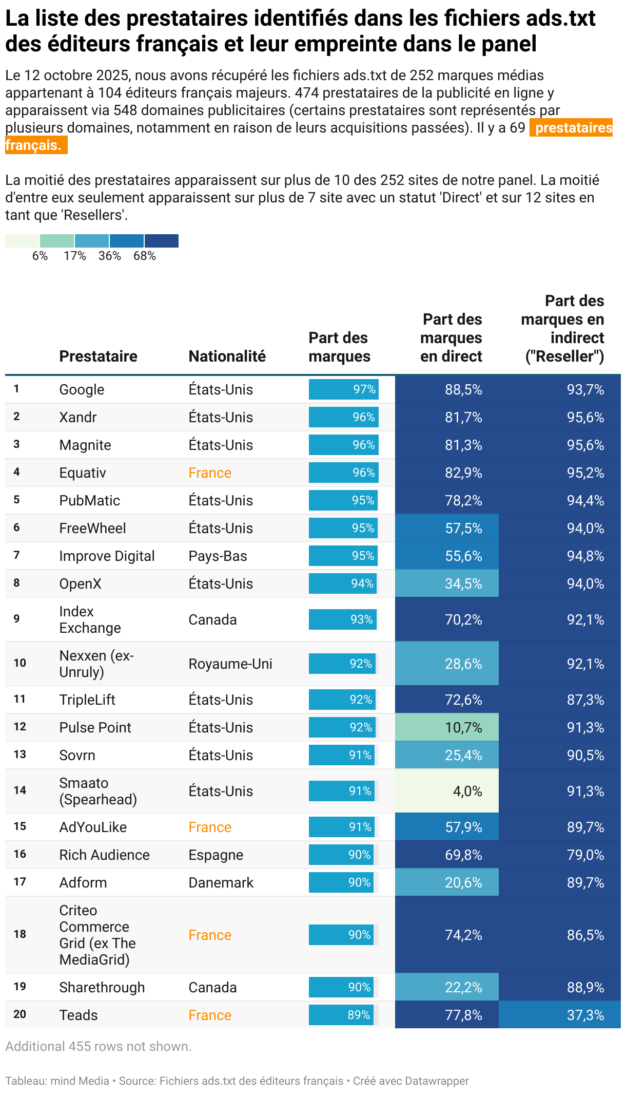 Accueil > Data > Initiatives & panoramas > La liste des sociétés présentes dans les fichiers ads.txt des éditeurs français La liste des sociétés présentes dans les fichiers ads.txt des éditeurs français Chaque jour, mind Media consulte les fichiers ads.txt des sites des principaux éditeurs français afin de mesurer l'empreinte des prestataires publicitaires qui y figurent. Parmi ces plus de 500 sociétés originaires du monde entier, quelles sont celles qui sont connectées au plus grand nombre d'acteurs ? Le sont-elles plutôt en direct ou en tant que revendeurs ? Nous avons aussi récupéré les fichiers sellers.json d'une grande partie de ces prestataires pour en analyser le profil dans un tableau dédié. Explorez les données de notre tracker des relations médias - prestataires mis à jour quotidiennement. Par Sara Chaouki et Aymeric Marolleau. Publié le 22 juin 2025 à 17h26 - Mis à jour le 01 octobre 2025 à 10h22 Ressources Les relations entre les éditeurs français et leurs prestataires de vente (SSP, adexchanges…) sont majoritairement indirectes, via des sous-régies. Parmi les prestataires français identifiés, Equativ est celui qui a la plus grande empreinte, devant AdYouLike, Teads et Criteo. Consultez dans notre tableau la liste de tous les prestataires identifiés dans les fichiers ads.txt des sites médias de notre panel : Trackers liés Vous souhaitez connaître le détail des éditeurs et sites médias français avec lesquels ces prestataires ont noué un lien, et connaître l’identité de l’éventuelle sous-régie pour laquelle ils travaillent, grâce à leurs fichiers sellers.json ? Consultez notre tracker dédié à la liste des relations établies entre les éditeurs français et les vendeurs et revendeurs programmatiques. Vous souhaitez connaître les données que ces acteurs souhaitent récolter ? Consultez notre tracker dédié au suivi de la Global vendor list. Les fichiers sellers.json sont le pendant des fichiers ads.txt côté sociétés adtech. Les prestataires de vente dont les noms de domaines apparaissent dans les fichiers ads.txt des éditeurs sont tenus d’avoir un fichier dans lequel ils précisent l’identité des éditeurs ou intermédiaires avec lesquels ils ont noué un lien. Ils y indiquent le nom de domaine des éditeurs auxquels ils envoient des flux financiers parce qu’ils leur ont donné mandat pour proposer leur inventaire aux DSP, ou bien des intermédiaires (des sous-régies, des alliances programmatiques, d’autres SSP et adexchanges) qui les utilisent pour proposer, toujours aux DSP, l’inventaire des éditeurs qu’ils agrègent. Dans le détail, ces fichiers contiennent plusieurs informations sur les acteurs qui souhaitent vendre leur inventaire via ces SSPs et adexchanges, comme leur nom, leur domaine, les identifiants que la plateforme leur a accordé, ou encore la nature de leur activité. Celle-ci peut être de trois ordres : “publisher” s’ils sont les destinataires finaux des investissements publicitaires, intermédiaire” s’ils agrègent eux-mêmes des inventaires et versent une part des revenus à des éditeurs (autres adexchanges, sous-régies, alliances programmatiques…) ou “both” s’ils sont dans ces deux situations à la fois. Consultez dans le tableau ci-dessous, pour les prestataires qui apparaissent dans les fichiers ads.txt de notre panel d’éditeurs français, et dont nous avons pu récupérer les fichiers sellers.json, les données agrégées de ces fichiers : Nos analyses : Fichiers ads.txt (1/2) : les éditeurs français ont augmenté de 72 % le nombre de leurs vendeurs et revendeurs programmatiques depuis 2019 Fichiers ads.txt (2/2) : qui sont les 430 prestataires qui ont accès à l’inventaire publicitaire d’au moins un éditeur français ? Sellers.json (1/3) : Quels SSP ont le chemin le plus direct vers les éditeurs ? Sellers.json (2/3) : le header bidding a raréfié les inventaires exclusifs Sellers.json (3/3) : pourquoi les SSP et adexchanges ont multiplié les interconnexions entre eux Méthodologie Début janvier 2022, nous avons récupéré, grâce à un crawler interne se fondant principalement sur la librairie Requests de Python, le contenu des fichiers ads.txt de 92 éditeurs français sur les 114 de notre panel. Ceci nous a permis de construire un tableau de plus de 200 000 lignes listant les différentes relations de vente directe et de revente établies entre les éditeurs français et les prestataires publicitaires. Le tableau contient quatre informations principales : Éditeurs, qui contient le nom des éditeurs du panel, Prestataires, qui contient les noms des prestataires déclarés être en relation avec l’éditeur, Nature de la relation, qui indique si la relation entre le prestataire et l’éditeur est directe ou indirecte, ID, qui contient l’identifiant du compte que le vendeur associe au détenteur du compte (un intermédiaire, par exemple une alliance programmatique ou bien l’éditeur lui-même). Pour affiner l’analyse, et grâce à des bases de données propriétaires sur les éditeurs et les prestataires publicitaires, nous avons qualifié les différents acteurs figurant dans le tableau, par la catégorie, la nationalité et le positionnement sur la chaîne de valeur publicitaire. Si les fichiers ads.txt sont généralement les mêmes sur tous les sites d’un éditeur, il arrive qu’ils diffèrent. Pour faciliter l’analyse par éditeur, nous avons fusionné, pour chacun d’entre eux, les prestataires figurant sur tous les sites de l’éditeur. Pour faciliter la lecture des résultats, nous-nous sommes efforcés d’attribuer les noms de domaines publicitaires contenus dans les fichiers ads.txt aux prestataires (SSP, adexchanges) auxquels ils sont attachés. Par exemple, Amazon en compte cinq: amazon-adsystem.com, amazon.com, aps.amazon.com, c.amazon-adsystem.com et app.amazon.com. Par soucis de clarté, lorsqu’un prestatair