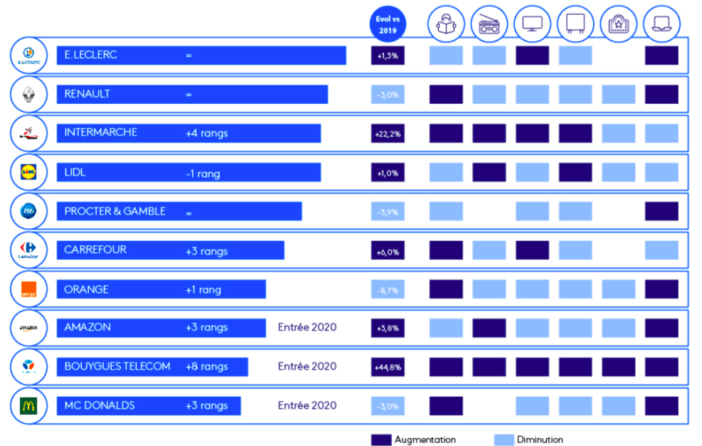 Accueil > Marques & Agences > Kantar : le top 100 des annonceurs français en 2020 marqué par la crise sanitaire Kantar : le top 100 des annonceurs français en 2020 marqué par la crise sanitaire Par . Publié le 01 avril 2021 à 17h45 - Mis à jour le 01 avril 2021 à 17h45 Ressources Dans le classement des 10 premiers annonceurs français en pression publicitaire en 2020 réalisé par Kantar et publié fin mars, E. Leclerc occupe la première place (au lieu de la deuxième en 2019), avec une hausse d’1,9 % de sa pression publicitaire, estimée à 460 millions d’euros par Stratégies (Kantar ne précisant plus les montants d’investissements publicitaires annuels). Il est talonné par Renault, qui passe de la troisième à la deuxième place, avec 434 millions d’euros (- 3 %). Avec une hausse de 22 % de son budget, à 417 millions d’euros, Intermarché grimpe de la neuvième à la troisième place. Suivent ensuite Lidl, Procter & Gamble, Carrefour, Orange, Amazon, Bouygues Télécom et McDonald’s. À retenir. Comme le souligne Stratégies, l’évolution du top 100 des annonceurs en France est marquée par la crise sanitaire : la plupart des principaux distributeurs alimentaires y sont ainsi représentés ; les services de livraison de repas sont en croissance, en particulier Deliveroo (+ 60 %) qui intègre directement la 67e place ; tandis que la plus grosse progression est celle du ministère de la Santé et des Solidarités avec + 3368 %, ce qui le fait entrer dans le classement à la 38e place. Achat médiaCovid-19Grande distributionSantéStratégies annonceurs Besoin d’informations complémentaires ? Contactez le service d’études à la demande de mind À lire Étude BUMP : les investissements en communication des annonceurs ont diminué de 21,6 % en 2020 Au premier semestre 2020, les annonceurs français ont diminué leurs investissements de 28 % De nouveaux annonceurs font leur première apparition durant la crise essentiels Nos synthèses et chiffres sur les principales thématiques du marché Les mutations du search à l'ère de l'IA générative L'application inaboutie de la loi sur les droits voisins Google vs DOJ : tout ce qu'il faut savoir sur le procès qui pourrait redéfinir l'adtech L’essentiel sur les identifiants publicitaires La transformation du marché publicitaire en 2024 2023 : le marché publicitaire doit se préparer à la fin du tracking utilisateur Comment l’intelligence artificielle générative bouleverse les médias Les enjeux réglementaires des médias en 2023 analyses Les articles d'approfondissement réalisés par la rédaction L’Apig et le SEPM fustigent le discours de Google concernant l’absence de l’AI Mode en France L'IA tient-elle ses promesses dans le marketing et l'achat média ? L’IA dans les rédactions : les exemples de l’AFP, Ouest-France et Humanoid Synthèse de l'étude mind Media-366 sur l’IA générative appliquée à la recherche, aux médias et à la publicité INFO MIND MEDIA - Yahoo lance un plan social en France pour se séparer de son équipe éditoriale Baromètre RECMA - mind Media : le bilan des gains de budgets en France depuis début 2025 Heikel Manai (France Télévisions) : “En matière d’IT, un dogmatisme 100% européen serait contre-productif” INFO MIND MEDIA - L’Équipe gagne son match judiciaire contre Fedcom Media CGV 2026 des régies TV : un pas supplémentaire vers la simplification du trading Mara Negri (EBX) : “Notre objectif est de proposer des inventaires BVOD et CTV dans l’ensemble des pays européens" data Les baromètres, panoramas et chiffres sur l'évolution du marché Le classement des éditeurs français qui ont le plus d'abonnés purs numériques Les données récoltées par les acteurs de la publicité en ligne La liste des sociétés présentes dans les fichiers ads.txt des éditeurs français Les gains de budget des agences médias Opt-out : quels éditeurs français interdisent les robots crawlers de l'IA générative ? Le panorama des sociétés spécialisées dans les technologies de l’e-retail media La liste des outils utilisés par les équipes éditoriales, marketing et techniques des éditeurs français Le détail des aides à la presse, année par année La liste des CMP choisies par les principaux médias en France Digital Ad Trust : quels sites ont été labellisés, pour quelles vagues et sur quel périmètre ?