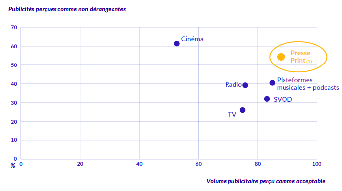 Accueil > Marques & Agences > L’ACPM publie une étude pour valoriser l’attention publicitaire sur les supports de presse L’ACPM publie une étude pour valoriser l’attention publicitaire sur les supports de presse Par Jean-Michel De Marchi. Publié le 11 juin 2024 à 17h59 - Mis à jour le 11 juin 2024 à 17h59 Ressources Selon une étude sur l’attention publicitaire sur les supports papier et numériques de la presse, publiée mardi 11 juin par l’ACPM au bénéfice des éditeurs, la lecture de la presse papier suscite à 93 % “l’impression d’avoir été concentré” chez les lecteurs interrogés (1 462 personnes âgées de 15 ans et plus via un via un questionnaire en ligne administré par Kantar, du 31 janvier au 14 février 2024, et eye-tracking réalisé par Mediamento du 9 au 17 février 2024 auprès de 54 participants). Le support se classe deuxième derrière le cinéma (92 %) et devant la télévision (73 %), les plateformes musicales et podcasts (60 %), la SVOD (59 %), la presse numérique (55 %) et la radio (41 %). La presse est par ailleurs le deuxième média – derrière le cinéma – sur lequel la publicité est perçue comme “la moins intrusive ou dérangeante”. À retenir. Les éditeurs médias, et en particulier ceux issus de la presse, tentent de valoriser leurs contextes publicitaires auprès des agences et des annonceurs pour attirer davantage leurs investissements. L’étude observe plusieurs indicateurs (notoriété, branding, confiance, qualité de l’expérience, mémorisation, performance) et a vocation à perdurer. Jean-Michel De Marchi Achat médiaEtudesMesure médiaSites d'actualité Besoin d’informations complémentaires ? Contactez le service d’études à la demande de mind À lire Etudes Attention publicitaire : FranceTV Publicité chiffre l'écart entre environnements TV, YouTube et réseaux sociaux Analyses Mesure de l'attention : iProspect déploie la solution d'IAS Analyses Dossiers CGV TV 2024 : comment les régies publicitaires audiovisuelles veulent simplifier leurs offres et mieux exploiter les données Entretiens Caroline Hugonenc (Teads) : "N'attendons pas qu'un standard de l'attention publicitaire soit défini, les annonceurs ont tout à gagner à la tester rapidement" Entretiens Alexandra Chabanne (GroupM) : "Notre métier est de trouver le juste équilibre entre investissement technologique et humain" Mesure de l’attention : le New York Times s’associe à Adelaide Analyses Dossiers Le regard des professionnels de l’adtech sur les enjeux du secteur en 2024 Le Guardian promeut sur son site les articles qui génèrent un temps passé important IAS lance son indicateur de mesure de l'attention Guillaume Goudal (L’Oréal France) : “Je suis prêt à payer plus cher la publicité en télévision si…” essentiels Nos synthèses et chiffres sur les principales thématiques du marché Les mutations du search à l'ère de l'IA générative L'application inaboutie de la loi sur les droits voisins Google vs DOJ : tout ce qu'il faut savoir sur le procès qui pourrait redéfinir l'adtech L’essentiel sur les identifiants publicitaires La transformation du marché publicitaire en 2024 2023 : le marché publicitaire doit se préparer à la fin du tracking utilisateur Comment l’intelligence artificielle générative bouleverse les médias Les enjeux réglementaires des médias en 2023 analyses Les articles d'approfondissement réalisés par la rédaction L’Apig et le SEPM fustigent le discours de Google concernant l’absence de l’AI Mode en France L'IA tient-elle ses promesses dans le marketing et l'achat média ? L’IA dans les rédactions : les exemples de l’AFP, Ouest-France et Humanoid Synthèse de l'étude mind Media-366 sur l’IA générative appliquée à la recherche, aux médias et à la publicité INFO MIND MEDIA - Yahoo lance un plan social en France pour se séparer de son équipe éditoriale Baromètre RECMA - mind Media : le bilan des gains de budgets en France depuis début 2025 Heikel Manai (France Télévisions) : “En matière d’IT, un dogmatisme 100% européen serait contre-productif” INFO MIND MEDIA - L’Équipe gagne son match judiciaire contre Fedcom Media CGV 2026 des régies TV : un pas supplémentaire vers la simplification du trading Mara Negri (EBX) : “Notre objectif est de proposer des inventaires BVOD et CTV dans l’ensemble des pays européens" data Les baromètres, panoramas et chiffres sur l'évolution du marché Le classement des éditeurs français qui ont le plus d'abonnés purs numériques Les données récoltées par les acteurs de la publicité en ligne La liste des sociétés présentes dans les fichiers ads.txt des éditeurs français Les gains de budget des agences médias Opt-out : quels éditeurs français interdisent les robots crawlers de l'IA générative ? Le panorama des sociétés spécialisées dans les technologies de l’e-retail media La liste des outils utilisés par les équipes éditoriales, marketing et techniques des éditeurs français Le détail des aides à la presse, année par année La liste des CMP choisies par les principaux médias en France Digital Ad Trust : quels sites ont été labellisés, pour quelles vagues et sur quel périmètre ?