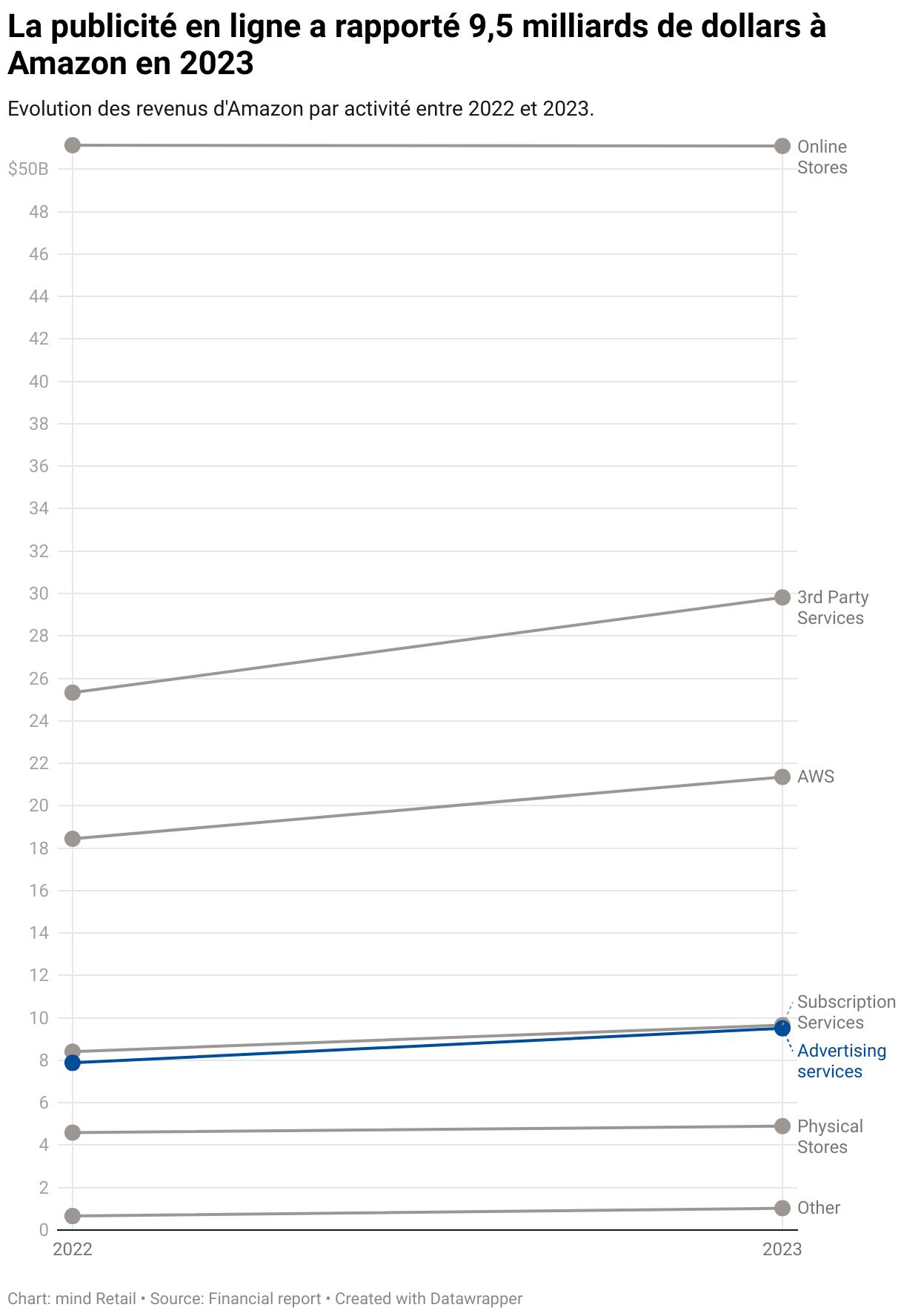Accueil > Médias & Audiovisuel > Amazon : les recettes publicitaires en hausse de 27 % en 2023 Amazon : les recettes publicitaires en hausse de 27 % en 2023 Par Raphaële Karayan. Publié le 02 février 2024 à 13h33 - Mis à jour le 07 février 2025 à 13h58 Ressources Les revenus publicitaires d’Amazon ressortent en hausse de 26 % sur un an au quatrième trimestre 2023, à 14,65 milliards de dollars selon les résultats publiés par le groupe jeudi 1er février. Sur l’ensemble de l’exercice, la progression s’élève à 27 %, et cette ligne de revenus dépasse désormais 8 % de l’activité totale (contre 7 % en 2022). Le bénéfice net global bondit à 10,6 milliards de dollars sur le trimestre, multiplié par 38 par rapport au 4e trimestre 2022. Le chiffre d’affaires s’inscrit en hausse de 14 % à 170 milliards. Sur l’exercice 2023, Amazon a réalisé un chiffre d’affaires de 574,8 milliards de dollars (+12 %) et dégagé un résultat net de 30,4 milliards, contre une perte nette de 2,7 milliards en 2022. À retenir. Amazon a lancé le 29 janvier aux Etats-Unis son offre de vidéo à la demande avec publicité, attendue au printemps en France. Les analystes estiment que la publicité sur Prime Video devrait rapporter entre 1 et 3 milliards de dollars cette année, sans compter les revenus additionnels issus des abonnements pour les utilisateurs qui paieront les 3 dollars supplémentaires pour échapper à la publicité. Raphaële Karayan AmazonAVODRésultats économiquesRetail media Besoin d’informations complémentaires ? Contactez le service d’études à la demande de mind À lire Analyses Les tendances du retail media vues au salon NRF 2024 de New York Entretiens Jérémy Parola (Reworld Media) : "Nous voulons exploiter la data de Tradedoubler et être présent sur toute la stack du content-to-commerce" Analyses Entretiens Thomas Jamet (IPG Mediabrands) : "Nous allons assister au retour des agences à forte personnalité" Amazon Prime Video fera payer trois euros de plus ses forfaits sans publicité Analyses Les six grands enjeux des médias et de la publicité en 2024 Analyses SVOD en France : un marché de plus en plus concurrentiel et des évolutions profondes en cours Analyses Le rebond des investissements publicitaires en France au deuxième semestre 2023 profite surtout aux plateformes Amazon Prime Video diffusera des spots "shoppables" le jour du Black Friday essentiels Nos synthèses et chiffres sur les principales thématiques du marché Les mutations du search à l'ère de l'IA générative L'application inaboutie de la loi sur les droits voisins Google vs DOJ : tout ce qu'il faut savoir sur le procès qui pourrait redéfinir l'adtech L’essentiel sur les identifiants publicitaires La transformation du marché publicitaire en 2024 2023 : le marché publicitaire doit se préparer à la fin du tracking utilisateur Comment l’intelligence artificielle générative bouleverse les médias Les enjeux réglementaires des médias en 2023 analyses Les articles d'approfondissement réalisés par la rédaction L’Apig et le SEPM fustigent le discours de Google concernant l’absence de l’AI Mode en France L'IA tient-elle ses promesses dans le marketing et l'achat média ? L’IA dans les rédactions : les exemples de l’AFP, Ouest-France et Humanoid Synthèse de l'étude mind Media-366 sur l’IA générative appliquée à la recherche, aux médias et à la publicité INFO MIND MEDIA - Yahoo lance un plan social en France pour se séparer de son équipe éditoriale Baromètre RECMA - mind Media : le bilan des gains de budgets en France depuis début 2025 Heikel Manai (France Télévisions) : “En matière d’IT, un dogmatisme 100% européen serait contre-productif” INFO MIND MEDIA - L’Équipe gagne son match judiciaire contre Fedcom Media CGV 2026 des régies TV : un pas supplémentaire vers la simplification du trading Mara Negri (EBX) : “Notre objectif est de proposer des inventaires BVOD et CTV dans l’ensemble des pays européens" data Les baromètres, panoramas et chiffres sur l'évolution du marché Le classement des éditeurs français qui ont le plus d'abonnés purs numériques Les données récoltées par les acteurs de la publicité en ligne La liste des sociétés présentes dans les fichiers ads.txt des éditeurs français Les gains de budget des agences médias Opt-out : quels éditeurs français interdisent les robots crawlers de l'IA générative ? Le panorama des sociétés spécialisées dans les technologies de l’e-retail media La liste des outils utilisés par les équipes éditoriales, marketing et techniques des éditeurs français Le détail des aides à la presse, année par année La liste des CMP choisies par les principaux médias en France Digital Ad Trust : quels sites ont été labellisés, pour quelles vagues et sur quel périmètre ?