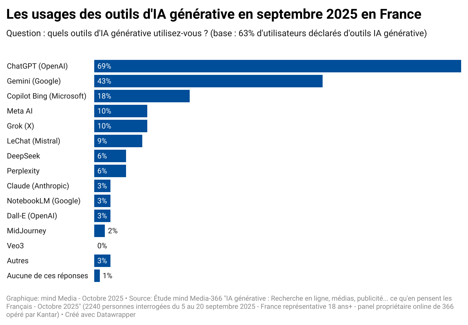 Accueil > Médias & Audiovisuel > IA générative : ChatGPT et Gemini loin devant les autres outils en France, selon notre étude mind Media-366 IA générative : ChatGPT et Gemini loin devant les autres outils en France, selon notre étude mind Media-366 Par Jean-Michel De Marchi. Publié le 16 octobre 2025 à 16h48 - Mis à jour le 16 octobre 2025 à 16h48 Ressources Trois ans après le lancement mondial de ChatGPT, l’outil proposé par OpenAI fait figure de leader dans les usages. Ainsi, selon notre étude mind Media-366 sur l’IA appliquée à la recherche, aux médias et à la publicité en France (2 240 personnes interrogées en septembre via Kantar), parmi les 63% de personnes qui déclarent utiliser un outil d’IA générative, 69% d’entre elles affirment emploie l’outil d’OpenAI, loin devant Gemini (Google) à 43 %. Copilot Bing (Microsoft) est le troisième outil le plus utilisé, à 18%. Les usages s’avèrent fréquents : 74% des personnes utilisatrices affirment s’en servir au moins une fois par semaine. À retenir. Ces usages sont réalisés exclusivement avec des versions gratuites à 80%, exclusivement avec des versions payantes à 4%, et à la fois avec des versions gratuites et payantes selon les outils à 16%. 82% des utilisateurs emploient l’IA générative pour des tâches personnelles, 37% pour le travail (60% chez les CSP+) et 16% pour des tâches scolaires et académiques. En attendant la publication de la version complète de notre étude le 23 octobre qui sera accessible pour nos abonnés ou auprès de notre responsable commercial Jean-Philippe Piau, mind Media met à disposition dès maintenant une synthèse des résultats en téléchargement ici. Jean-Michel De Marchi Etudes mind Media-366IA générativeIntelligence artificielleTechnologies Besoin d’informations complémentaires ? Contactez le service d’études à la demande de mind À lire IA générative : 63% d’utilisateurs réguliers en France, selon notre étude mind Media-366 Le Figaro explique son partenariat avec Perplexity Les mutations du search à l'ère de l'IA générative L’Apig et le SEPM demandent la redistribution aux médias des amendes prononcées par l'Autorité de la concurrence Media.Figaro passe à la 2e étape de la construction de son outil de mediaplanning Comment l’intelligence artificielle générative bouleverse les médias Perplexity freine le développement de la publicité dans ses produits Confidentiels INFO MIND MEDIA - Yahoo lance un plan social en France pour se séparer de son équipe éditoriale AI Mode étend sa couverture en Europe, la France écartée Confidentiels INFO MIND MEDIA - Yahoo a conclu un accord cadre de droits voisins avec DVP essentiels Nos synthèses et chiffres sur les principales thématiques du marché Les mutations du search à l'ère de l'IA générative L'application inaboutie de la loi sur les droits voisins Google vs DOJ : tout ce qu'il faut savoir sur le procès qui pourrait redéfinir l'adtech L’essentiel sur les identifiants publicitaires La transformation du marché publicitaire en 2024 2023 : le marché publicitaire doit se préparer à la fin du tracking utilisateur Comment l’intelligence artificielle générative bouleverse les médias Les enjeux réglementaires des médias en 2023 analyses Les articles d'approfondissement réalisés par la rédaction Synthèse de l'étude mind Media-366 sur l’IA générative appliquée à la recherche, aux médias et à la publicité INFO MIND MEDIA - Yahoo lance un plan social en France pour se séparer de son équipe éditoriale Baromètre RECMA - mind Media : le bilan des gains de budgets en France depuis début 2025 Heikel Manai (France Télévisions) : “En matière d’IT, un dogmatisme 100% européen serait contre-productif” INFO MIND MEDIA - L’Équipe gagne son match judiciaire contre Fedcom Media CGV 2026 des régies TV : un pas supplémentaire vers la simplification du trading Mara Negri (EBX) : “Notre objectif est de proposer des inventaires BVOD et CTV dans l’ensemble des pays européens" INFO MIND MEDIA - L’alliance adtech des médias français Mediasquare peine elle aussi à faire condamner Google en justice IA générative : panorama des solutions techniques de protection et de monétisation des contenus Fermeture de Xandr DSP : qui va gagner la bataille des budgets ? data Les baromètres, panoramas et chiffres sur l'évolution du marché Le classement des éditeurs français qui ont le plus d'abonnés purs numériques Les données récoltées par les acteurs de la publicité en ligne La liste des sociétés présentes dans les fichiers ads.txt des éditeurs français Les gains de budget des agences médias Opt-out : quels éditeurs français interdisent les robots crawlers de l'IA générative ? Le panorama des sociétés spécialisées dans les technologies de l’e-retail media La liste des outils utilisés par les équipes éditoriales, marketing et techniques des éditeurs français Le détail des aides à la presse, année par année La liste des CMP choisies par les principaux médias en France Digital Ad Trust : quels sites ont été labellisés, pour quelles vagues et sur quel périmètre ?