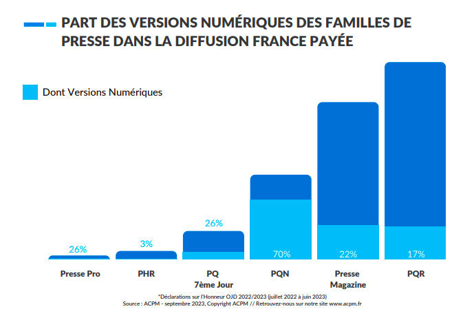 Accueil > Médias & Audiovisuel > La PQR et la presse magazine en retard sur la conversion en abonnés numériques La PQR et la presse magazine en retard sur la conversion en abonnés numériques Par Jean-Michel De Marchi. Publié le 14 septembre 2023 à 17h54 - Mis à jour le 16 septembre 2023 à 20h16 Ressources La presse quotidienne régionale (PQR) représente 38 % des 7,5 millions d’exemplaires vendus par jour en moyenne par les éditeurs de presse français (- 3,8 % en un an), éditions papier et numérique confondues. La presse magazine 34 %, et la presse quotidienne nationale (PQN) 16 %. Ce sont quelques-uns des enseignements tirés du bilan de la diffusion et de la fréquentation de la presse française certifiées publié par l’ACPM jeudi 14 septembre pour la période de juillet 2022 à juin 2023. Le mobile représente 84 % de leurs visites en ligne. À retenir. Si la presse magazine et la PQR ont une diffusion plus de deux fois supérieure à la PQN, elles ne sont, dans leur ensemble, pas encore parvenu à convertir leurs lecteurs en abonnés en ligne, et ce malgré des audiences numériques conséquentes. Ainsi, 17 % seulement de la diffusion France payée de la PQR relève du numérique (et 83 % du papier), selon les déclarations déposées à l’ACPM, et 22 % pour la presse magazine, quand la proportion s’élève à 70 % pour la PQN. Un risque pour leurs modèles du fait de la baisse structurelle de la diffusion papier et des difficultés publicitaires pour les médias. Jean-Michel De Marchi Abonnements numériquesACPMAudiences et diffusionInformation localePresse magazineSites d'actualité Besoin d’informations complémentaires ? Contactez le service d’études à la demande de mind À lire Abonnements numériques : la PQR tarde à franchir le cap Abonnements numériques (2/2) : après la conquête, l’augmentation des revenus par abonné ? Analyses Dossiers Abonnements numériques (1/2) : les lecteurs sont de plus en plus difficiles à convaincre Entretiens Marc Feuillée (Le Figaro) : "La loi sur les Droits voisins doit être amendée par le législateur" Analyses La diffusion des quotidiens français poursuit sa décroissance Baisse du trafic sur X : la fin programmée des réseaux sociaux comme apporteurs de trafic ? Mouvements Antoine Daccord pressenti à la direction de La Croix Le Monde dépasse la barre symbolique des 500 000 abonnés numériques Le Monde a augmenté d’un euro le tarif mensuel de ses offres d'abonnement numérique Analyses Le Point revoit en profondeur ses activités numériques Analyses 70 % des revenus du Guardian proviennent du numérique The Guardian va lancer une édition numérique européenne Analyses Entretiens Gabriel d’Harcourt (Groupe La Provence-Corse Matin) : “L’objectif est d’augmenter de 20 à 30 % nos audiences en ligne dès 2023” Analyses Entretiens Nicolas Sterckx (Groupe Sud-Ouest) : “On ne s’interdit pas de sortir de notre territoire régional via certaines verticales” Analyses Entretiens Jean-Louis Pelé (Groupe Nice-Matin) : “Nous visons une progression de nos revenus de 15 % en 2023” Confidentiels [Info mind Media] Une nouvelle responsable du web à La Provence Analyses Confidentiels [Info mind Media] Subscribe with Google va être ouvert à de nouveaux médias en France Les Français sont abonnés à quatre services en ligne en moyenne essentiels Nos synthèses et chiffres sur les principales thématiques du marché Les mutations du search à l'ère de l'IA générative L'application inaboutie de la loi sur les droits voisins Google vs DOJ : tout ce qu'il faut savoir sur le procès qui pourrait redéfinir l'adtech L’essentiel sur les identifiants publicitaires La transformation du marché publicitaire en 2024 2023 : le marché publicitaire doit se préparer à la fin du tracking utilisateur Comment l’intelligence artificielle générative bouleverse les médias Les enjeux réglementaires des médias en 2023 analyses Les articles d'approfondissement réalisés par la rédaction L’Apig et le SEPM fustigent le discours de Google concernant l’absence de l’AI Mode en France L'IA tient-elle ses promesses dans le marketing et l'achat média ? L’IA dans les rédactions : les exemples de l’AFP, Ouest-France et Humanoid Synthèse de l'étude mind Media-366 sur l’IA générative appliquée à la recherche, aux médias et à la publicité INFO MIND MEDIA - Yahoo lance un plan social en France pour se séparer de son équipe éditoriale Baromètre RECMA - mind Media : le bilan des gains de budgets en France depuis début 2025 Heikel Manai (France Télévisions) : “En matière d’IT, un dogmatisme 100% européen serait contre-productif” INFO MIND MEDIA - L’Équipe gagne son match judiciaire contre Fedcom Media CGV 2026 des régies TV : un pas supplémentaire vers la simplification du trading Mara Negri (EBX) : “Notre objectif est de proposer des inventaires BVOD et CTV dans l’ensemble des pays européens" data Les baromètres, panoramas et chiffres sur l'évolution du marché Le classement des éditeurs français qui ont le plus d'abonnés purs numériques Les données récoltées par les acteurs de la publicité en ligne La liste des sociétés présentes dans les fichiers ads.txt des éditeurs français Les gains de budget des agences médias Opt-out : quels éditeurs français interdisent les robots crawlers de l'IA générative ? Le panorama des sociétés spécialisées dans les technologies de l’e-retail media La liste des outils utilisés par les équipes éditoriales, marketing et techniques des éditeurs français Le détail des aides à la presse, année par année La liste des CMP choisies par les principaux médias en France Digital Ad Trust : quels sites ont été labellisés, pour quelles vagues et sur quel périmètre ?