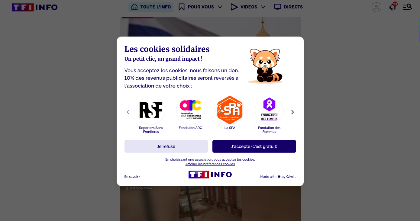 Accueil > Médias & Audiovisuel > Les groupes TF1 et M6 intègrent un dispositif de don à leurs CMP Les groupes TF1 et M6 intègrent un dispositif de don à leurs CMP Par Jean-Michel De Marchi. Publié le 29 septembre 2025 à 15h46 - Mis à jour le 30 septembre 2025 à 11h55 Ressources Le groupe TF1 utilise depuis lundi 22 septembre le mécanisme d’optimisation des CMP de Gimii sur TF1 Info, tandis que M6 le déploiera dans quelques semaines sur les supports de RTL, RTL2 et Fun Radio, a appris mind Media. La solution de cette start-up française, fondée en 2023 par Thomas Gicquel, ancien salarié de AdUx, Prisma Media et Equativ, avec Julien Sergent et Quentin Pomarel, s’appuie sur le don. Quand l’éditeur choisit de l’utiliser (ce n’est pas systématique), cet outil intègre dans la CMP un message pour demander aux utilisateurs d’accepter le dépôt de cookies publicitaires en contrepartie de quoi l’éditeur reverse une partie des revenus publicitaires générés par leurs visites à une ou plusieurs associations de leur choix, parmi un portefeuille de 150 en partenariat chez la start-up, ou celles que l’éditeur veut ajouter. Les Restos du Coeur, la SPA, la Fondation ARC pour la recherche sur le cancer, et RSF sont parmi ceux affichés sur l’interface de TF1 Info. TF1 annonce un reversement de 10%. Le consentement obtenu est conservé six mois, avant d’être redemandé. Parmi les autres clients médias de la start-up : Leboncoin, Reworld Media, CultureG, groupe AVIV (SeLoger…). La solution de Gimii – qui revendique 150 000 euros reversés à des associations en un an – complète les CMP et ne s’y substitue pas. À retenir. Pour maximiser le consentement des utilisateurs à la collecte de leurs données personnelles, les éditeurs médias ont axé leur communication ces dernières années sur leur bon usage et leurs impératifs économiques. Cette solution s’appuie, elle, sur une incitation caritative plus concrète et gagnant-gagnant. Interrogé par mind Media, Gimii annonce un taux de consentement client qui peut progresser de 10 à 20 points en un an, en fonction de la qualité des contenus et du taux préalable de consentement. Rappelons que le taux de consentement aux cookies et traceurs se situe entre 60 et 80% selon les éditeurs, et qu’un peu plus de 70% des CMP des principaux éditeurs médias français sont fournies par Didomi, selon notre baromètre. Jean-Michel De Marchi AdtechCMPDonnées personnellesPublicité programmatiqueRégiesSites d'actualitéStart-upTransformation de l'audiovisuel Besoin d’informations complémentaires ? Contactez le service d’études à la demande de mind À lire Analyses CGV 2026 des régies TV : un pas supplémentaire vers la simplification du trading Analyses [Baromètre] Les CMP installées par les principaux sites médias en France en avril 2025 Analyses Dossiers Étude mind Media-366 : le marché publicitaire français au défi de l'adblocking Didomi rachète la CMP américaine Sourcepoint Analyses Programmatique : un marché qui se dégrade, même sur la vidéo instream essentiels Nos synthèses et chiffres sur les principales thématiques du marché Les mutations du search à l'ère de l'IA générative L'application inaboutie de la loi sur les droits voisins Google vs DOJ : tout ce qu'il faut savoir sur le procès qui pourrait redéfinir l'adtech L’essentiel sur les identifiants publicitaires La transformation du marché publicitaire en 2024 2023 : le marché publicitaire doit se préparer à la fin du tracking utilisateur Comment l’intelligence artificielle générative bouleverse les médias Les enjeux réglementaires des médias en 2023 analyses Les articles d'approfondissement réalisés par la rédaction INFO MIND MEDIA - L’Équipe gagne son match judiciaire contre Fedcom Media Mara Negri (EBX) : “Notre objectif est de proposer des inventaires BVOD et CTV dans l’ensemble des pays européens" INFO MIND MEDIA - L’alliance adtech des médias français Mediasquare peine elle aussi à faire condamner Google en justice IA générative : panorama des solutions techniques de protection et de monétisation des contenus Fermeture de Xandr DSP : qui va gagner la bataille des budgets ? Adtech : les réactions et analyses du secteur à la condamnation de Google par la Commission européenne Hélène Zemmour (TV5Monde) : “TV5MondePlus va devenir notre plateforme unique de streaming vidéo” Pseudonymisation : comment la décision de la CJUE dans l’affaire CRU/CEPD impacte l'industrie de l'adtech AI search : quels changements dans les stratégies de référencement ? Adtech : pourquoi la Commission européenne sanctionne Google de près de 3 milliards d’euros data Les baromètres, panoramas et chiffres sur l'évolution du marché Le classement des éditeurs français qui ont le plus d'abonnés purs numériques Les données récoltées par les acteurs de la publicité en ligne La liste des sociétés présentes dans les fichiers ads.txt des éditeurs français Les gains de budget des agences médias Opt-out : quels éditeurs français interdisent les robots crawlers de l'IA générative ? Le panorama des sociétés spécialisées dans les technologies de l’e-retail media La liste des outils utilisés par les équipes éditoriales, marketing et techniques des éditeurs français Le détail des aides à la presse, année par année La liste des CMP choisies par les principaux médias en France Digital Ad Trust : quels sites ont été labellisés, pour quelles vagues et sur quel périmètre ?
