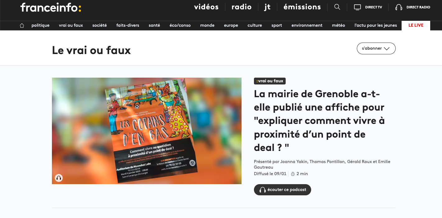 Accueil > Médias & Audiovisuel > Radio France veut renforcer la vérification de l’information Radio France veut renforcer la vérification de l’information Par Jean-Michel De Marchi. Publié le 09 janvier 2024 à 17h33 - Mis à jour le 09 janvier 2024 à 17h34 Ressources Le directeur de l’information de Radio France, Jean-Philippe Baille, a indiqué mardi 9 janvier, lors d’une conférence de presse avec l’Association des journalistes médias, vouloir renforcer l’Agence Radio France. Créé en 2016, cet organe interne vérifie et certifie les informations avant leur publication. Initialement rattaché à la radio et à la chaîne TV France Info, il travaille pour toutes les antennes du groupe depuis 2022. La structure de 15 personnes traite 20 000 dépêches par an. Des moyens supplémentaires pourraient lui être accordés. Dans le même esprit, Radio France va renforcer le dispositif “Vrai du Faux” – qui fait aussi office de label -, instauré en 2019 pour la veille sur les plateformes sociales, le fact-checking et le décryptage. Il devrait être étendu dans les semaines qui viennent à d’autres médias publics – France Médias Monde et INA – et décliné sur une plateforme dédiée et sur une chaîne WhatsApp. À retenir. Pour Jean-Philippe Baille, ces projets sont l’une des réponses à la défiance croissante du public envers les médias et une manière de renouer du lien. Ce sera l’un des thèmes de notre prochaine conférence mind Media Day en mars. Jean-Michel De Marchi RadioSites d'actualitéTransformation des médias Besoin d’informations complémentaires ? Contactez le service d’études à la demande de mind À lire [Conférence mind Media Day] 20 mars 2024 - Proximité et confiance dans les médias et la publicité : créer du lien pour créer de la valeur La confiance dans les médias s'érode un peu plus Les Français manquent de méthode pour s’informer correctement Analyses Confidentiels [Info mind Media] Médiamétrie va arrêter et remplacer les mesures eStat du streaming vidéo et du podcast Philippe Carli fait certifier le groupe EBRA par le label JTI de RSF [Info mind Media] IA générative : une douzaine de médias membres de l’APIG sont partenaires du projet Spinoza de RSF GroupM constitue en France une liste blanche de 240 sites d’informations Analyses Les dirigeants des groupes télévisuels français présentent leur vision du marché et leur stratégie essentiels Nos synthèses et chiffres sur les principales thématiques du marché Les mutations du search à l'ère de l'IA générative L'application inaboutie de la loi sur les droits voisins Google vs DOJ : tout ce qu'il faut savoir sur le procès qui pourrait redéfinir l'adtech L’essentiel sur les identifiants publicitaires La transformation du marché publicitaire en 2024 2023 : le marché publicitaire doit se préparer à la fin du tracking utilisateur Comment l’intelligence artificielle générative bouleverse les médias Les enjeux réglementaires des médias en 2023 analyses Les articles d'approfondissement réalisés par la rédaction L’Apig et le SEPM fustigent le discours de Google concernant l’absence de l’AI Mode en France L'IA tient-elle ses promesses dans le marketing et l'achat média ? L’IA dans les rédactions : les exemples de l’AFP, Ouest-France et Humanoid Synthèse de l'étude mind Media-366 sur l’IA générative appliquée à la recherche, aux médias et à la publicité INFO MIND MEDIA - Yahoo lance un plan social en France pour se séparer de son équipe éditoriale Baromètre RECMA - mind Media : le bilan des gains de budgets en France depuis début 2025 Heikel Manai (France Télévisions) : “En matière d’IT, un dogmatisme 100% européen serait contre-productif” INFO MIND MEDIA - L’Équipe gagne son match judiciaire contre Fedcom Media CGV 2026 des régies TV : un pas supplémentaire vers la simplification du trading Mara Negri (EBX) : “Notre objectif est de proposer des inventaires BVOD et CTV dans l’ensemble des pays européens" data Les baromètres, panoramas et chiffres sur l'évolution du marché Le classement des éditeurs français qui ont le plus d'abonnés purs numériques Les données récoltées par les acteurs de la publicité en ligne La liste des sociétés présentes dans les fichiers ads.txt des éditeurs français Les gains de budget des agences médias Opt-out : quels éditeurs français interdisent les robots crawlers de l'IA générative ? Le panorama des sociétés spécialisées dans les technologies de l’e-retail media La liste des outils utilisés par les équipes éditoriales, marketing et techniques des éditeurs français Le détail des aides à la presse, année par année La liste des CMP choisies par les principaux médias en France Digital Ad Trust : quels sites ont été labellisés, pour quelles vagues et sur quel périmètre ?