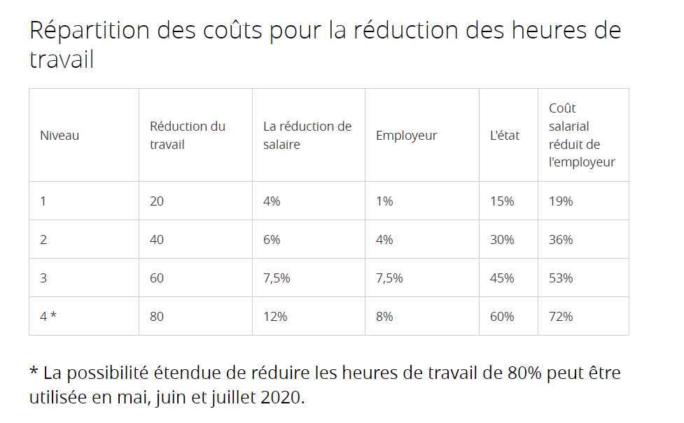 Pour mettre en place ce chômage partiel, l’employeur doit conclure un accord avec les employés s’il n’est pas lié par une convention collective, ou s’il est lié par une convention collective, avec les syndicats. Le tableau ci-dessous montre la répartition des coûts entre employés, employeurs et Etat pour la réduction des heures de travail.