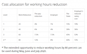 On 27 May, Parliament adopted the government's plan to augment the short-time working system (Korttidspermittering) by allowing up to an 80% reduction in working hours in May, June and July, compared with a maximum 60% previously. Employers can agree with their employees on a reduction in working hours for a period of six months, with the potential for a further three month extension if needed due to the Covid-crisis. The costs the scheme will be shared between the State, employers, and employees. With the earlier scheme employers could reduce employees' working hours by up to 60% and employees received 92.5% of their salary during this period. Under the new regulations, employers can reduce the working time of employees by up to 80%; employers would pay 8% of the non-working salary, the state would compensate 60%, and employees would bear 12% of the costs. The table below summarizes the breakdown of the costs according to working time reduction levels.