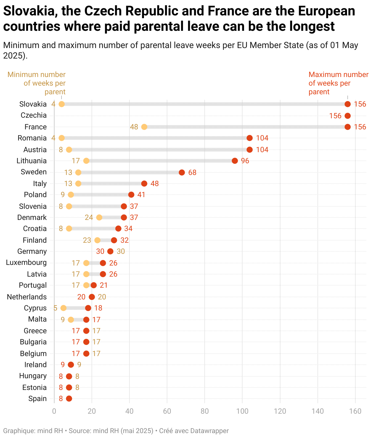 Home » Legal developments » National legislation » mind RH study – Parental leave allowances still not compliant with EU directive in all member states mind RH study – Parental leave allowances still not compliant with EU directive in all member states Six EU member states amended their legislation between July 2024 and March 2025 to encourage more parents, especially fathers, to take parental leave. To this end, Cyprus, Ireland and Italy have extended the length of time for which compensation is paid, almost five years after the European directive on work-life balance came into force. The aim is to encourage a better distribution of family tasks and thereby increase the employment rate at a time of skills shortages. By Nathalie TranSara Chaouki. Published on 22 May 2025 à 12h00 - Update on 22 May 2025 à 12h00 Resources By introducing parental leave of at least four months for each parent, two of which cannot be transferred from one to the other, the European directive on work-life balance for parents and carers has led to progress in several member states. This is the case, for example, in Hungary, where parental leave has finally been introduced. Nonetheless, some countries still fall short of the minimum two months reserved exclusively for each parent. This is particularly true of Spain, Estonia and Hungary, which have opted for eight weeks’ non-transferable individual parental leave. [mind RH study] EU: parental leave continues to vary greatly from country to country Encouraging fathers to take parental leave This minimum two-month non-transferable leave for each parent, provided for in the European directive, is intended to enable a better distribution of family responsibilities and thus improve professional equality between men and women.… Nathalie TranSara Chaouki Need more info ? Contact mind's on-demand study service Which service do you want to contact :WritingCommercial serviceTechnical SupportFirst nameLast nameOrganizationFunctionemail* Object of the messageYour messageRGPD J’accepte la politique de confidentialité.URLThis field is for validation purposes and should be left unchanged. Essentials Latest articles Longer careers: a new state of affairs for companies CSRD: social and environmental reporting market takes shape Analysis & Data Latest articles Paternity leave: data observations from 41 countries EU: during H1 2022 five EU Member States have raised their minimum salary levels