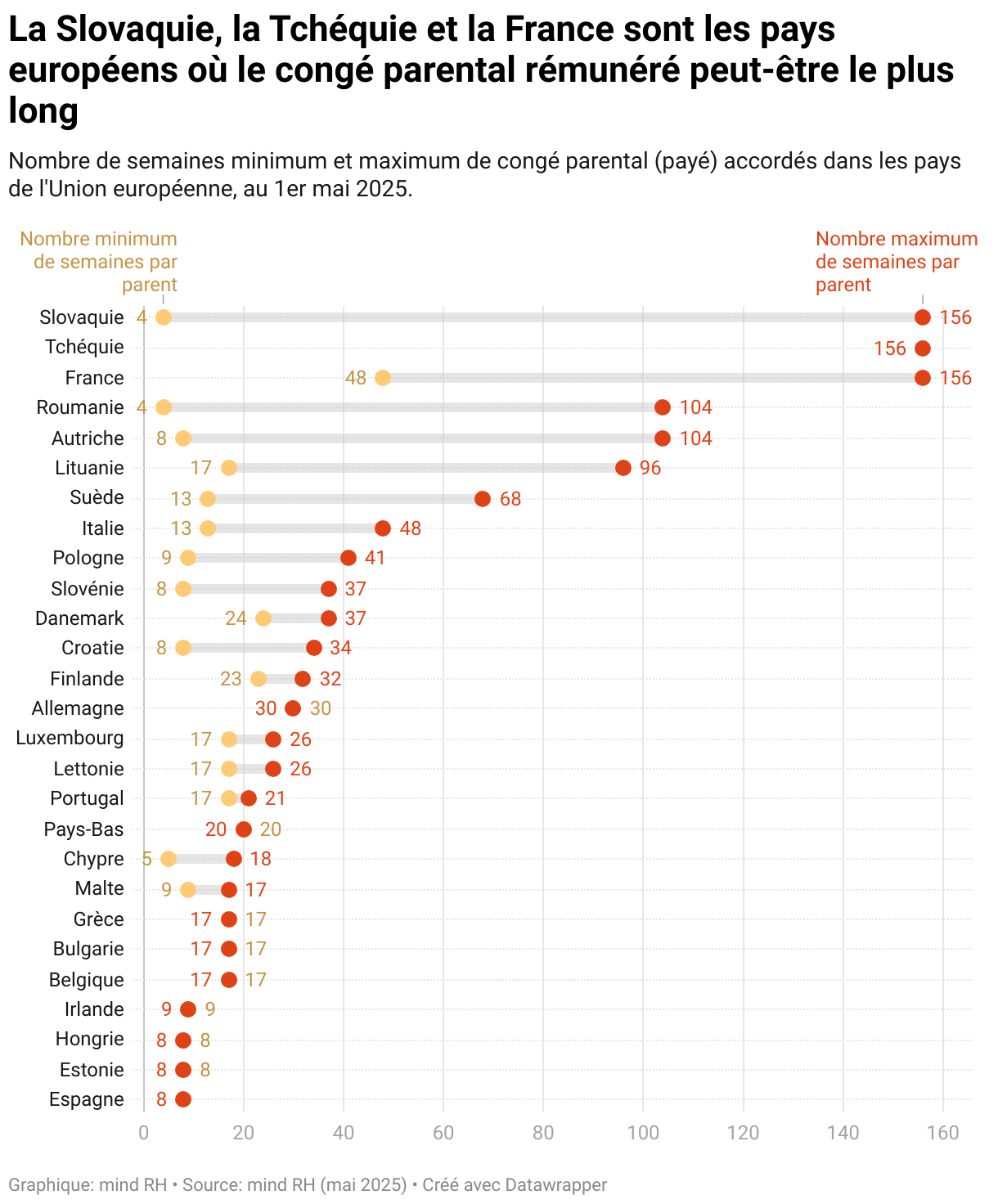 Accueil » Evolutions juridiques » Législations nationales » Étude mind RH – Un congé parental toujours pas conforme à la directive européenne dans tous les États membres Étude mind RH – Un congé parental toujours pas conforme à la directive européenne dans tous les États membres Six États membres de l'UE ont modifié leur législation entre juillet 2024 et mars 2025 afin d’inciter un plus grand nombre de parents, et notamment de pères, à prendre un congé parental. À cet effet, Chypre, l’Irlande et l’Italie ont allongé la durée de l’indemnisation, près de cinq ans après l’entrée en vigueur de la directive européenne sur l’équilibre vie professionnelle et vie privée à laquelle trois pays ne se conforment toujours pas. L’enjeu est de favoriser une meilleure répartition des tâches familiales et par là même d’augmenter le taux d’emploi dans un contexte de pénurie de compétences. Par Nathalie Tran avec Sara Chaouki. Publié le 22 mai 2025 à 10h14 - Mis à jour le 22 mai 2025 à 18h20 Ressources En instaurant un congé parental d’au moins quatre mois pour chacun des parents, dont deux ne pouvant être transférés de l’un à l’autre, la directive européenne sur l’équilibre vie professionnelle et vie privée des parents et des aidants a permis des avancées dans plusieurs États membres. C’est le cas, par exemple, en Hongrie où un congé parental a enfin vu le jour. Néanmoins, certains pays sont toujours en deçà du minimum prévu, se calant sur les deux mois exclusivement réservés à chaque parent. C’est le cas notamment de l’Espagne, de l’Estonie et de la Hongrie qui ont opté pour un congé parental individuel non transférable de huit semaines. [étude mind RH] UE : un congé parental toujours très inégal selon les pays Inciter les père à prendre un congé parental Ce minimum de deux mois non transférables pour chacun des parents, prévu par le texte européen, a pour but de permettre une meilleure répartition des responsabilités familiales et d’améliorer ainsi l’égalité professionnelle entre les femmes et les hommes.… Nathalie Tran avec Sara Chaouki Congés parentauxParentalité Besoin d’informations complémentaires ? Contactez le service d’études à la demande de mind Quel service voulez-vous contacter :La rédactionLe service commercialLe support techniquePrénomNomOrganisationFonctionCourriel* Objet du messageVotre messageRGPD J’accepte la politique de confidentialité.EmailCe champ n’est utilisé qu’à des fins de validation et devrait rester inchangé. Essentiels Synthèse et historique de tous les contenus sur une thématique suivie en détails par la rédaction les derniers publications L’allongement des carrières, une nouvelle donne pour les entreprises CSRD : le marché du reporting social et environnemental se structure Analyses & Data Synthèse et historique de tous les contenus sur une thématique suivie en détails par la rédaction les derniers publications Congé de paternité : 41 pays à la loupe [data] UE : cinq États membres ont revalorisé leur salaire minimum au cours du premier semestre 2022